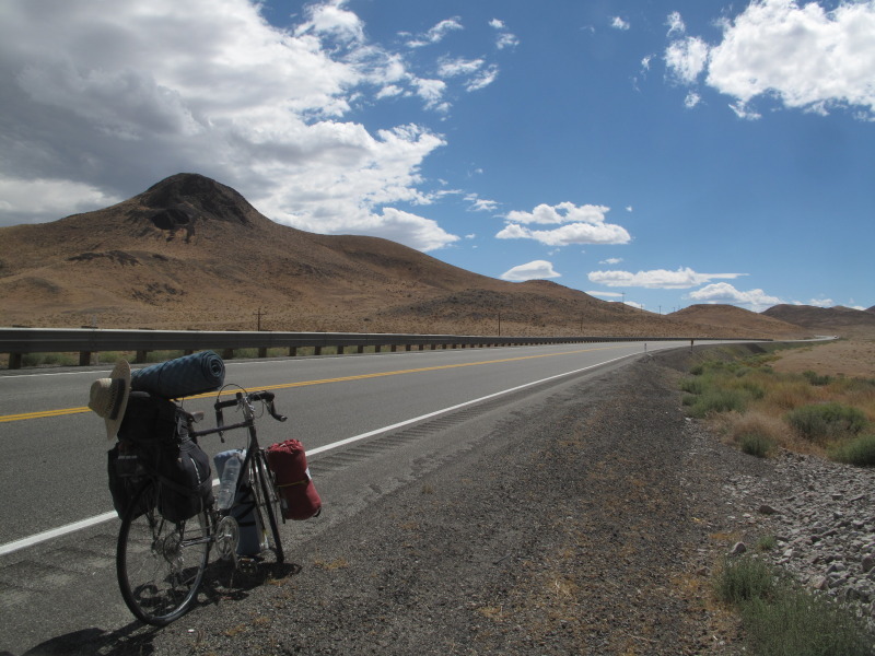 years or so, that are called rumble strips. They're little bumps notched into the sides of roads, designed to make your car rumble when you drive over them to let you know you've drifted out of your lane. Awesome for keeping drivers awake and alert. No so great for bikers trying to use the shoulder to travel. This rumble strip shown here is typical. It is a bit wide and leaves about a foot and a half of room for a biker (me in this case) to navigate. There are many highways in Nevada that have far less room than this. There is one stretch of highway 50 that had the entire shoulder dominated by rumble strip. That was a poopy stretch to travel. This here? Not much better. And the windy uphills make me worried I might not make the sixty miles and get a place to sleep. Which makes me push harder. There was a particularly long straight stretch where I thought I could pop into a high gear and just fly at over twenty miles an hour or so, but the wind shatters those dreams as I can only get a couple gears above the lowest. Fuck you wind. It was along that straight long stretch that a man coming toward me pulled over and put on his hazzards, I stopped to see if he was OK or if he wanted something from me. He got out of his car and ran across the highway with stuff cradled in his hands. He said that he had seen me this morning pushing uphill against the wind and felt so bad for me, that he went and got me a bag of trail mix and a bottle of water in case he saw me later in the day. And he did, and he gave me some trail mix and water. How cool. And as he was leaving to go back to his car, a young couple stopped to see if I was alright. I assured them I was, and the driver saw I wasn't wearing shoes, and took his off and tried to give them to me.