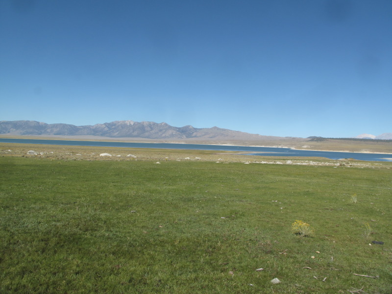 The guardrail there was just covered in stickers. It was pretty cool, I met a lot of people up there at that lookout. John from Alabama had been hiking in and around these mountains for the past ten days, he really loved all of the stickers and my adventure. He was sad to be going back home to Alabama where he will just be an engineer and not a free-wheeling backpacker in the high Sierras. I also met a couple of guys who were going to be doing a century ride tomorrow starting in Mammoth and swooping down to Mono Lake and way around and back to Mammoth. As impressed as I was at the thought of doing 100 miles in these mountains in one go, they were just as impressed with me riding alone across who-knows-what. I was up there for awhile before I decided enough was enough and it was time to see the lake. The ride down was pretty fun, I have to admit. The road was curvy and I got a lot of wheel shakes from the load I was carrying on my front tire, and I was riding my brakes most of the way down. The shoulder was small and had debris in it so I had to be careful. And some points I just rode out in the traffic lane to be safer. At any rate, I was down and to Mono Lake pretty quickly. I went out to the lake with the intention of jumping in, but the entire lake was covered in these little flies. Millions of little flies hugging the shore eating whatever was on the bottom on the lake before the water receded. And because of the billions of flies, there were thousands of seagulls.