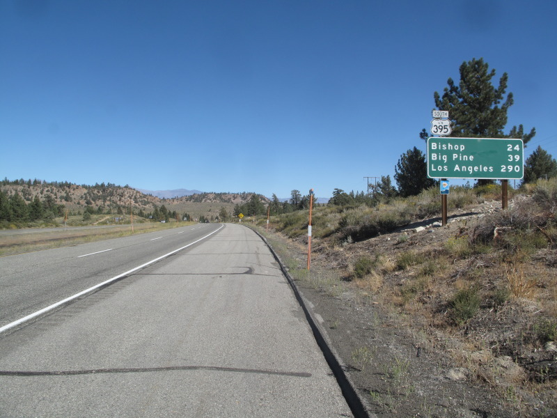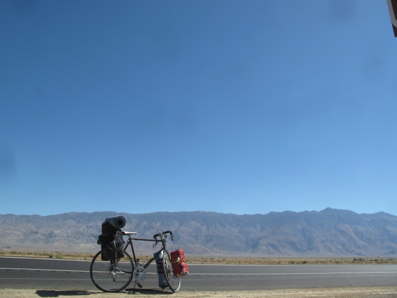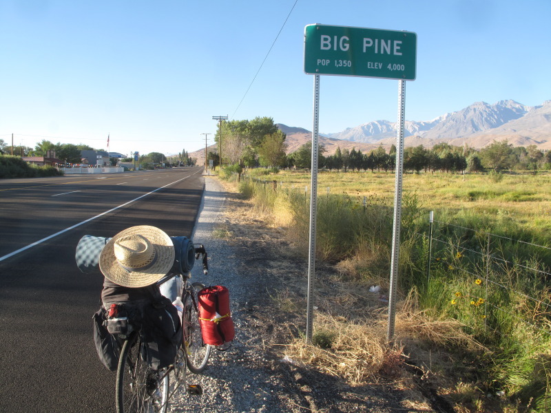 and it felt like there was a tailwind behind me. I was in my highest gear for most of the morning. And it felt great. My left knee didn't hurt as much as yesterday, but my right one joined it in a dull aching throb. That kind of pain was easy to ride with. At least the grind of pushing against the wind down hills in the lowest gear were behind me. This is more like what I imagined the trip to be like. I put in fifteen miles before stopping for breakfast in Big Pine. And after breakfast I was on the road again by nine. And still feeling fantastic. The miles were zipping by. Before I knew it I was in Lone Pine before noon,