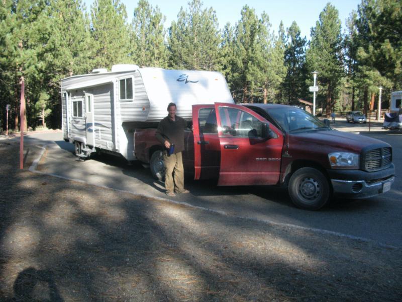 And then he bought my lunch for me and we ate it in the back patio lawn as we talked about Burning Man and biking and future plans. And it was nice. We sat out there and talked for quite awhile. I also wanted to rest after the strenuous day of climbing and not much eating. At the burger joint we met a couple of bikers in their biking sex outfits having lunch. I learned one of them was going to be going to Palmdale after some windy mountain riding. Good for him. When we left, Dean drove me to the top of the next hill before letting me off to be on my way. He was a bit concerned about my headache and dizziness, so he brought me to a place where it was pretty much downhill to the next town, Bridgeport. He also gave me another gift. I had mentioned to him that my saddle had broken somewhere along the way, and so he went to his bike shop to see if they had any used saddles, which they did, and he got it and gave it to me. So I installed my new saddle and reattached my front rack and put all of my crap back on and took off. He watched to make sure I didn't fall over and then I was off. I got to Bridgeport rather quickly, it being mostly downhill. I got to Bridgeport at about 4:30, and decided to push on to see how far I could get before sunset. About an hour out of town, I found a little place I wanted to stop and eat at, well, mostly I wanted to charge m'phone, but I wouldn't have minded a little something to eat after starving myself earlier. But this restaurant kicked me out for not having shoes, so I sat out on their front lawn and charged my phone with an outdoor outlet they had. I ate a couple Clif bars and watched the scenery. When the phone was about half charged, I took off. A few miles later I saw a dirt road called Green Creek Road, and for some reason I decided that there might be a nice place to camp somewhere down this dirt road. And sure enough, there was a closed campground. I staked out a nice little spot and set up camp. There was no sign of human life as far as the eye could see, it was awesome. here, look how awesome I thought it was:Also, I decided that I needed to whip out my beef jerky for the first time this trip, thinking I needed as much food in me as possible for the silly bit of not eating I did earlier. The reason I look so happy in this picture