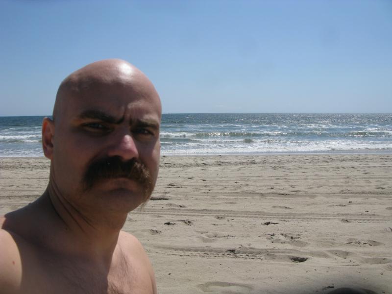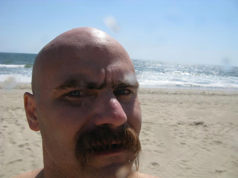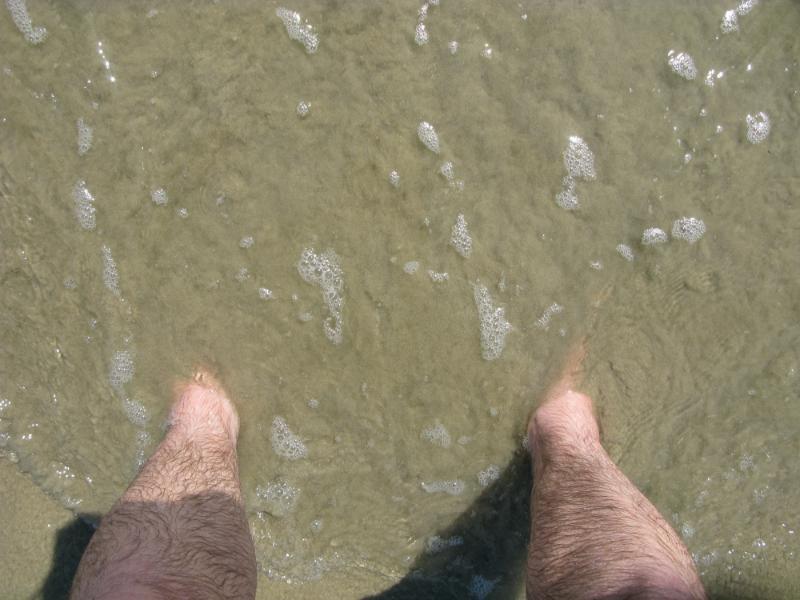 I have no idea how long I swam, but I'm guessing in the neighborhood of two hours. When I felt the first swell of a breaker go past me, feeling the current change for even that brief moment was like taking the best drug ever (I would imagine). It didn't take long after feeling that first swell that I was able to ride waves back to shore. I have rarely been as exhausted as I was upon reaching shore. My legs didn't really work too well. I stumbled out of the water onto the beach and there was a woman with three children near and she looked worried. I must have looked... interesting. I took a picture of myself right then so you could all see how I felt at that moment. Exhausted, sore and completely drained. But still alive.