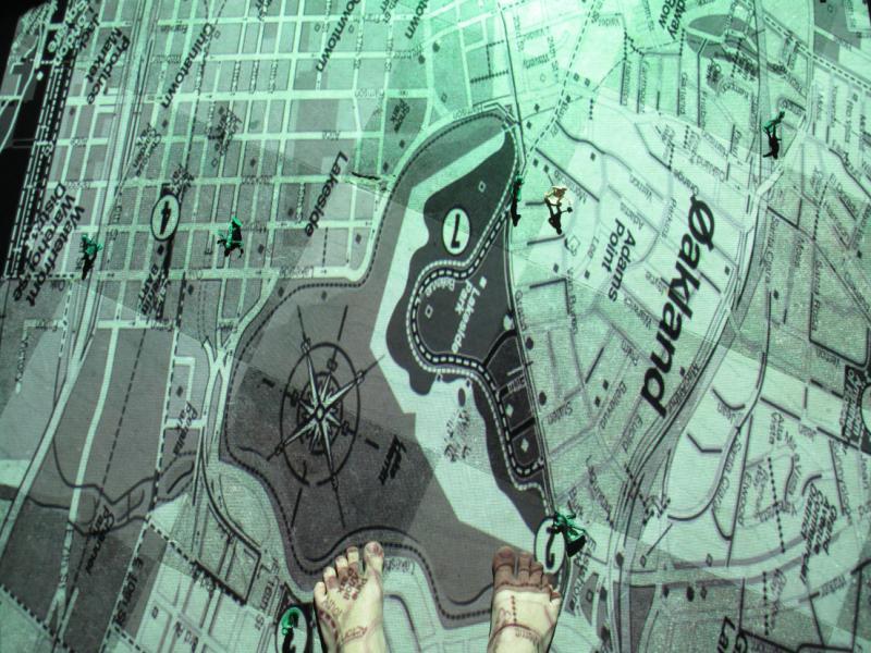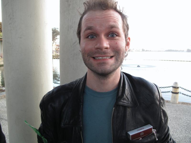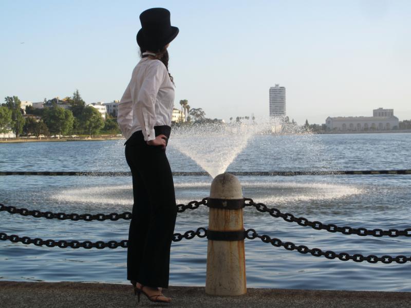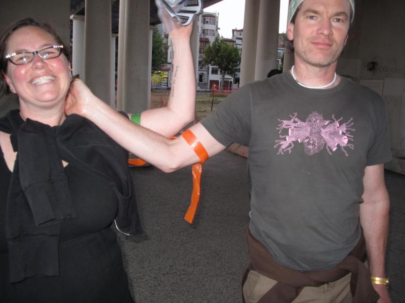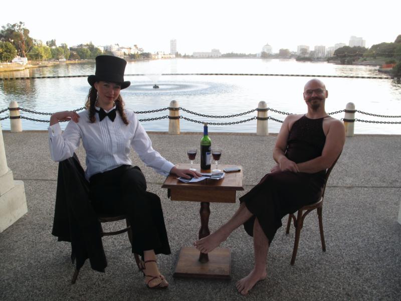 Myrna called Lincoln with the idea that she would be in a tuxedo and he'd be wearing a cocktail dress, "fishing" on Lake Merritt. Lincoln decided to do a completion of Donation By Other Means with every runner that came through the checkpoint. So Lincoln photographed every runner that came through the checkpoint.
