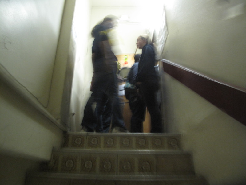 So we walked down to the sixth and last checkpoint. On our way to the checkpoint I saw Kristina (with a K) was walking away from us with her jellyfish costume protecting a couple of runners. She was leaving checkpoint six as we were approaching. I told her to hang out and wait for us (again), and she said she was busy (again), and I begged and she said maybe, so we ran to the next checkpoint to try to get though it quick-like. No such luck as the line for this last checkpoint was pretty long. It was in an old building with a spiral staircase that we went up to get to the checkpoint. There were fake thousand dollar bills taped all over the walls in the stairwell, and we got to talking to our fellow runners in the hall. One woman came down and waited for her boyfriend who was still up in the checkpoint and we talked about my shoes, and she couldn't believe I ran without them. And I told her it was way easier and better and healthier this way, and she kinda couldn't believe it. And then I told her that I never wear shoes, and she was a little incredulous. It took Waldo vouching for me for her to really believe it. When she left she said that meeting me was the best thing that happened to her all night. I don't know if I believed that. There was a lot of cool shit that happened already and we were pretty close to the end of the race. We went up another quarter flight of stairs, and there waiting for us was a blackjack dealer with a table in front of her. She beckoned us forward to play a game of blackjack, she needed four, so Waldo, Albert myself and somebody I didn't know played a hand, I got an 18 from the deal so held pat, Waldo hit once and then held, and Albert hit three times and held. Dealer hit and got a 20. Waldo got a 21 and redeemed us all. So we passed and went up to a dark hallway in an apartment and there were lasers criss-crossing the hall. They needed somebody to go through it without setting off the alarm by disrupting a laser's path. I volunteered, and approached the obstacle. As I was strategizing how to do it, somebody told me I had already failed. Apparently there was a laser right at the beginning a few feet before the rest of them, but it was invisible, and they apologized and sprayed more mist or whatever in the air so the lasers were less obscure. So I went through without a problem, I had to hit a switch to deactivate the alarm, and then my team came in behind me, there was a laptop there that we were told we had to break into in a minute. I gave the job to Waldo and stepped aside. I wandered around checking the place out, but noticed he tried and failed a few times, but after about thirty seconds, he cracked it. I have to admit I was impressed. We went further in and there were ladies at a bar and they put a gold star sticker on my manifest and off we went. We heard that because it was getting so late, and there was such a long line, that we were the last group to go through the whole scene. Everybody else would just come in and get their star and leave. Sucks for them, because I kinda loved the effort that went into checkpoint six.