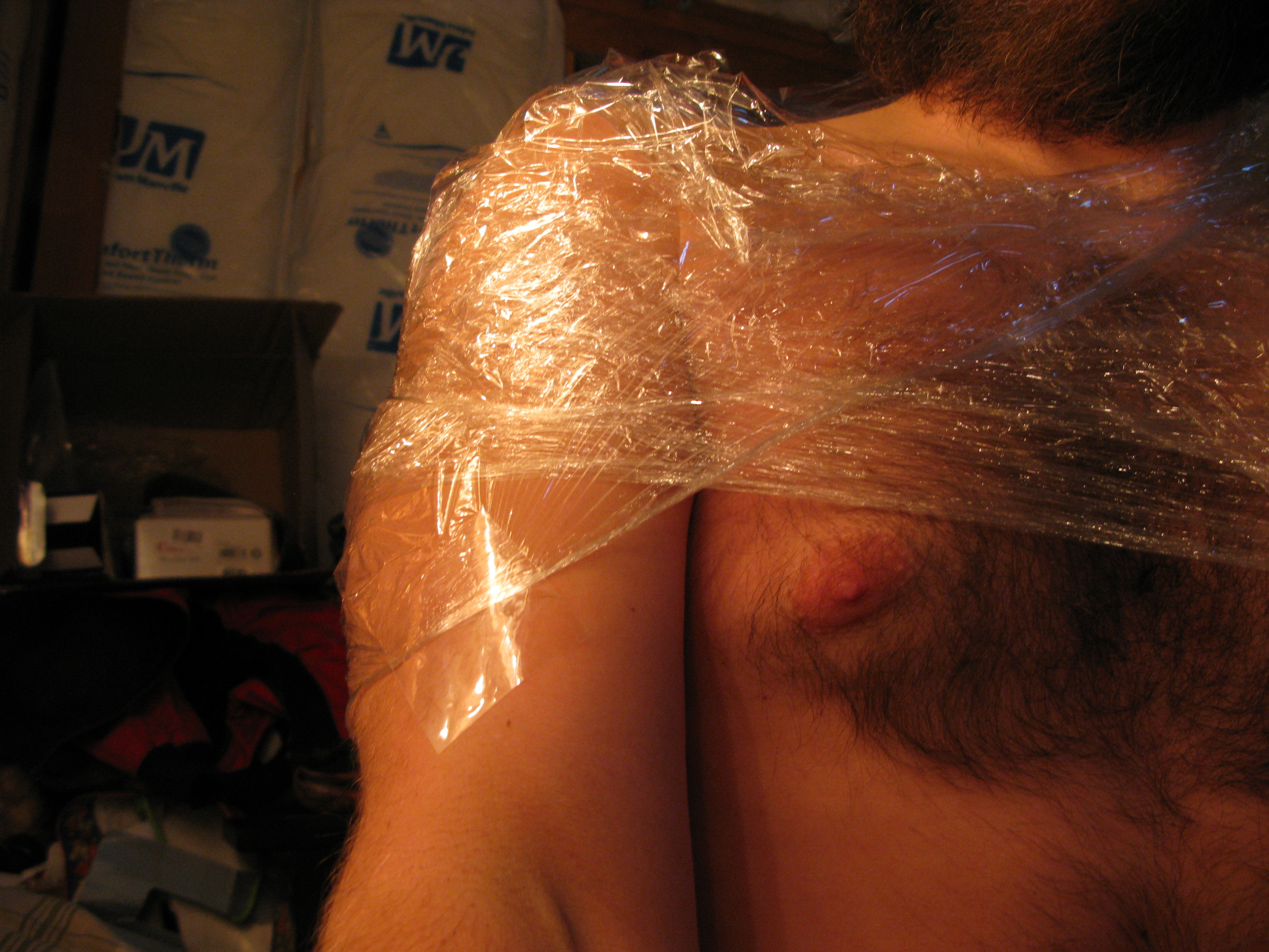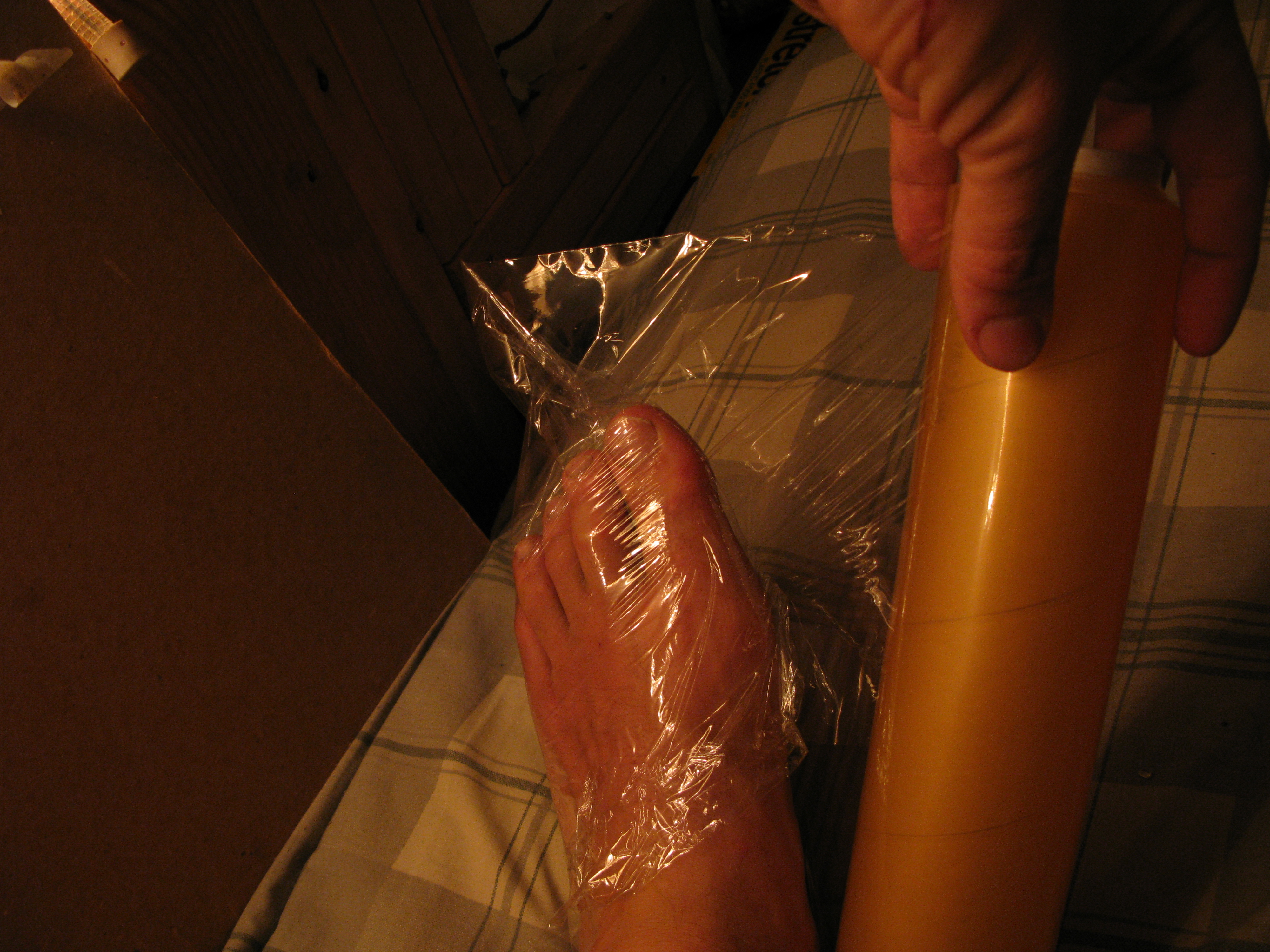 Because I'm Lincoln, we'll start with the foot. I wrap it up in Saran wrap. It's important that no skin is exposed.