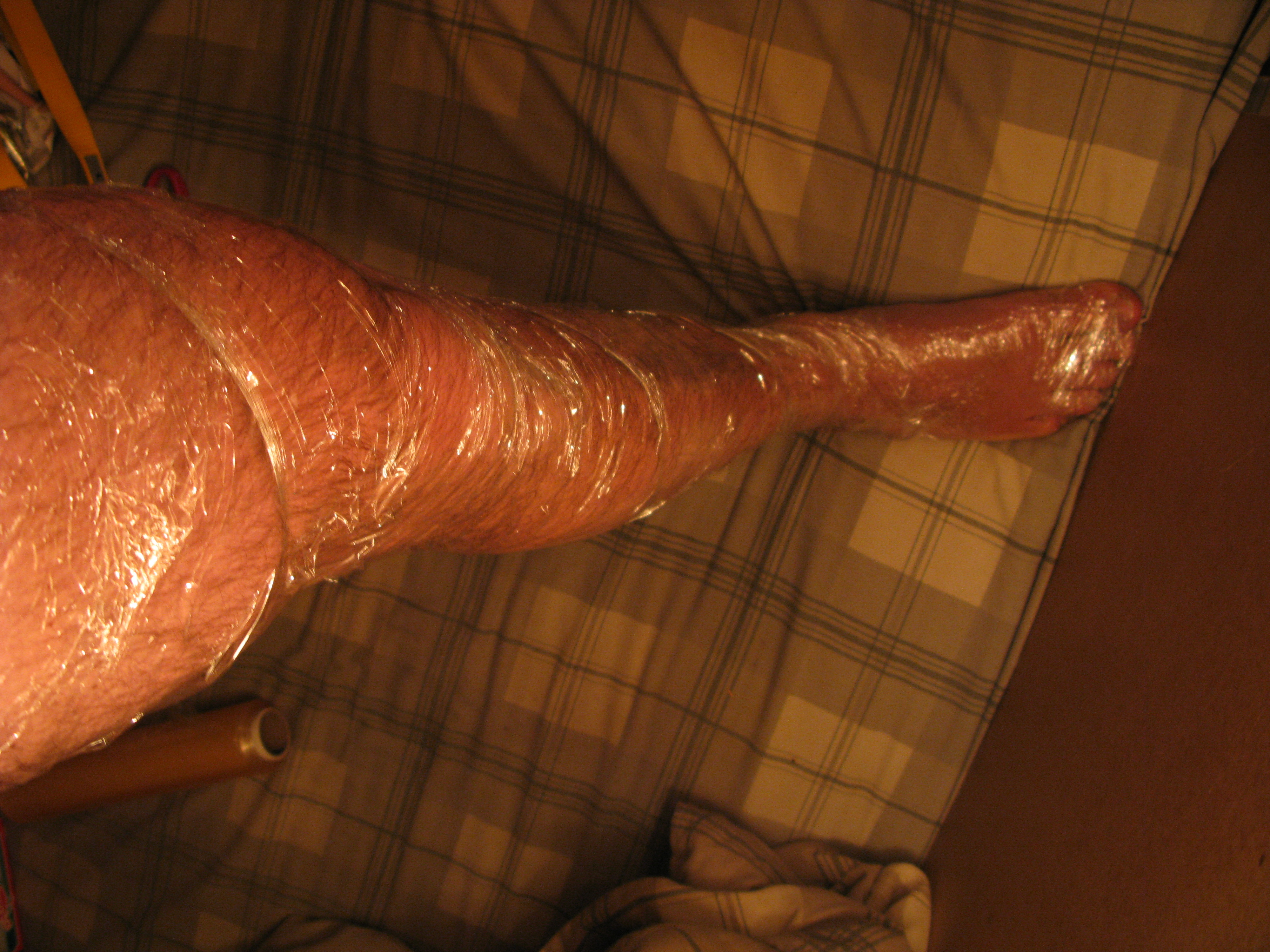 Then work all the way up the leg with the Saran Wrap. Again, make sure no skin is exposed. It's OK to double wrap.
