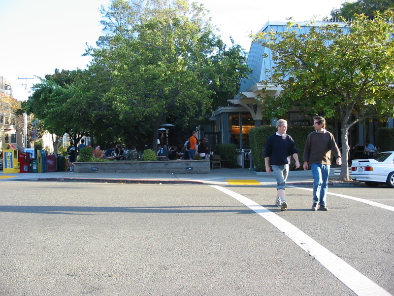 cafes with outdoor seating, signs, bike racks, city utility cabinets, newspaper racks, bus stop benches, parking meters, planters, light poles, utility poles, trees, broken pavement, traffic cones, and a dense flow of pedestrians, dogs, and skate-boards on the sidewalkevery one of them a puzzle that was deciphered and left behind. I can only come with adjectives from old SF magazines: Astounding! Amazing! Startling! Astonishing! Stirring!