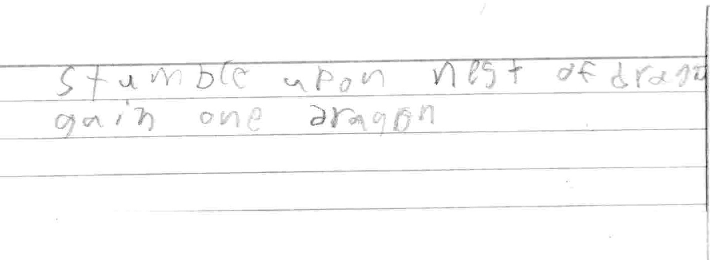 My little brother's creation: "Stumble upon nest of dragons gain one dragon." He played it for himself, of course.