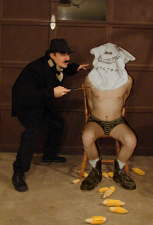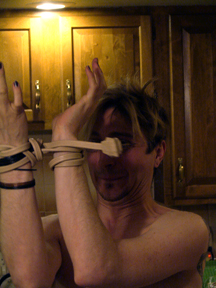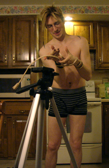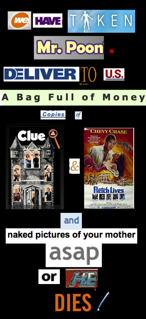 I will record myself in tying myself up. Ill get video of me sitting down in a char in a garage with nothing on but a pillowcase over my head with a smiley face drawn on it begging that "you should do whatever these people want...etc". I’ll Photoshop a picture of myself in the mustache threatening myself in the char. Ill make a ransom note of words cut and pasted from websites demanding "Nachos, a copy of Fletch Lives and a naked picture of your mother". I will then email all of it to everyone I know in SF.
