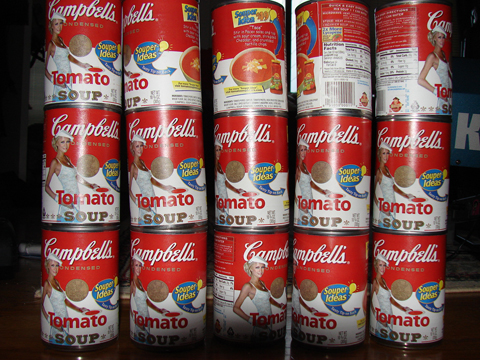 About 3 years ago I did an art piece of Paris Hilton which referenced Warhol’s Marilyn diptych and took a jab at contemporary conceptions of celebrity. It involved two large canvases and a stack of Campbell’s tomato soup cans with Paris herself hocking the product. I had had the idea for a wile to mine supermarkets with my nefarious products. keep in mind this was a couple years before this ever happened: great minds.