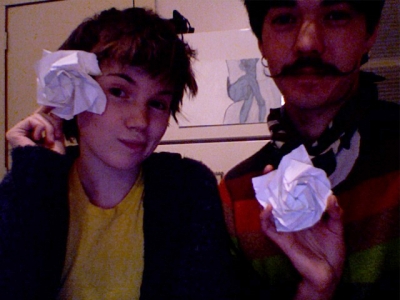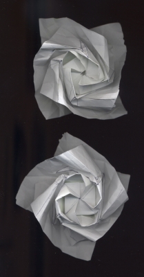 This inspired The Revolutionary to try to make such a rose for a puppet show, performed on December 28th. Terpsichore and he sat down at 9PM on the night of the 26th, with instructions for the folding of an origami rose designed by Toshikazu Kawasaki. The next two and a half hours were the greatest test of the sanity of these two stalwart taskers. The Kawasaki Rose is 5 pages of origami-instruction madness, each page more harrowing than the last. Only through teamwork and their insistence to prove their worth to the Tasker of Seoul did they manage to make it through all 29 steps. At one point Terpsichore went into convulsion for 15 seconds. The Revolutionary thought his teeth were chewing through his spinal chord for steps 13 through 29. This is not a task to be attempted alone.