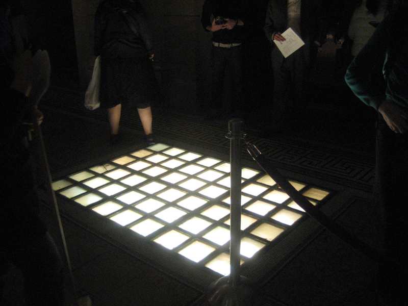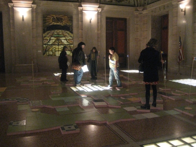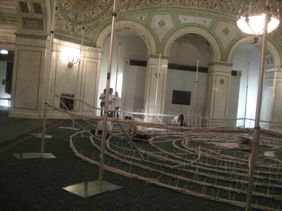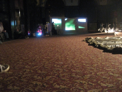 Of the ten projects being presented in the various rooms of the Cultural Center (a beautiful historical building that was originally an expansive library), Terpsi and I only managed to participate in five. The first of which involved using my imagination entirely, as it created no sound. By Terpsi's description, some performers were constructing something in a large room using sticks. After scanning through the program, she found the description for “HemiSPHERE” by WorkGroup, and determined that they were intent on imitating the structure of the Tiffany dome above them using rolled-up journals. The mental image I constructed was two skinny plainclothed performers lazily building a beaver dam out of paper – an image that probably had little semblance of what was actually going on. Without the recognizable sound of work, there was very little for me to go on besides the recognition of being in a very acoustically large room.