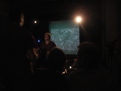 Terpsi would later describe this performance as being a chant, although I remember it seeming much more like an abstract radio drama. I could discern the voices of several different performers, who would take turns saying slices of text from the stage. I could sense that some were farther upstage than others, even if by only five or ten feet. One of them was speaking into a microphone, which disembodied her position, and thus, strangely, her existence in my perception of the performance. I could not gauge how large the audience was, although I knew from previous experience what the seating capacity should have been. When people were not speaking or moving, they were undetectable and effectively non-existent. I once heard a camera click from behind me, and heard some shuffling from the center of the auditorium. From this information alone, I would have guessed that there were a dozen people at most in the theater. Terpsi told me later that there was a fairly steady stream of visitors walking by us in the aisle throughout the performance, who made no trace of audible passage due to their respect for the performers. I heard two sounds consistently throughout the piece, which I assumed must have been coming from where else in the building: a breathing, like machinery, and an intermittent whistle, like a sports coach would blow. These sounds, along with the sparse sounds of audience movement, formed my understanding of the acoustical space I was in as much as the sounds of the performance, and, in a way that John Cage might champion, became integral in my awareness of what was happening around me.
