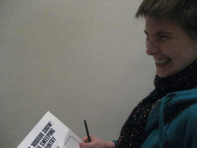 Outside the theater we were approached by SEN, who’s voice I recognized immediately, and felt safe with whatever she had in store for us. She was presenting an element of “SNAPSHOT” by Isil Egrikavuk, where visitors are invited to write news stories based on historical headlines, which would then be read aloud by a news anchor who was stationed on the first floor. Terpsi and I chose the headline, Punk Whore Show; Punks Sweep The Country. We sat down on the carpet, in the hallway, and I gave her some dictation which she interpreted liberally. She described the space on the page she was writing in as being a box that was ¾ of the size of the page, which I interpreted as being a lot of space. Apparently her handwriting is rather large, and it turned out to not be so much space. I found, too, that I had a hard time keeping words in my head without being able to see them appear in front of me; I’m used to writing with my hands, not my mouth. All in all, the project was entertaining. We never did deliver the paper to the news anchor downstairs, but the experience was rich even so. After finishing our writing on the back of the page, we got up and decided to track down the two sounds I had heard in the previous performance which had not been part of that performance.