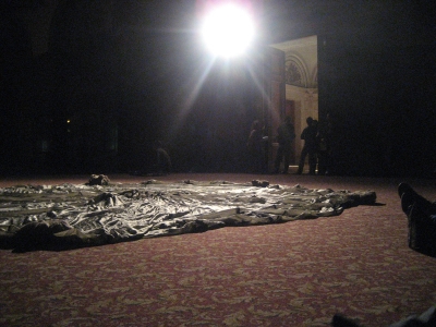 I felt the solidness of the foam block beneath my shoes, and felt no danger. I felt the edge of the block with my cane, and knew where it was safe to step. I heard the performers shuffling around my feet, moving foam blocks into position to form a path in front of me. They only communicated by blowing on their whistles, which was as helpful as I could have asked for, as it gave me direction and assurance. I stepped bravely forward, trusting that they were laying blocks in front of me in some sort of path. I imagined them crawling about on the floor, like servants before a despot, laying pavement for me so that I would not have to touch the ground. I didn’t like the status, but I adored the image. As Terpsi described later, they were in fact standing upright on shoes made of blocks of foam, shuttling the other blocks of foam around with brooms. I like this image much better, although I could not have imagined it from the sounds I was hearing, as all the sonic information was coming from below my knees. For the first time that night, a warm glow seeped through the cracks of the blindfold, and I perceived a brightly lit room. Later, on looking back through the program, I realize that this performance, “Island,” by Deva Eveland, was presented in the GAR Rotunda room, which has lights in the floor, and is in fact a rather dark space. My memory of the room, then, is wildly different in character from everyone else’s, because where I perceived I was walking around in full light, everyone else was seeing the room cast in eerie footlights.