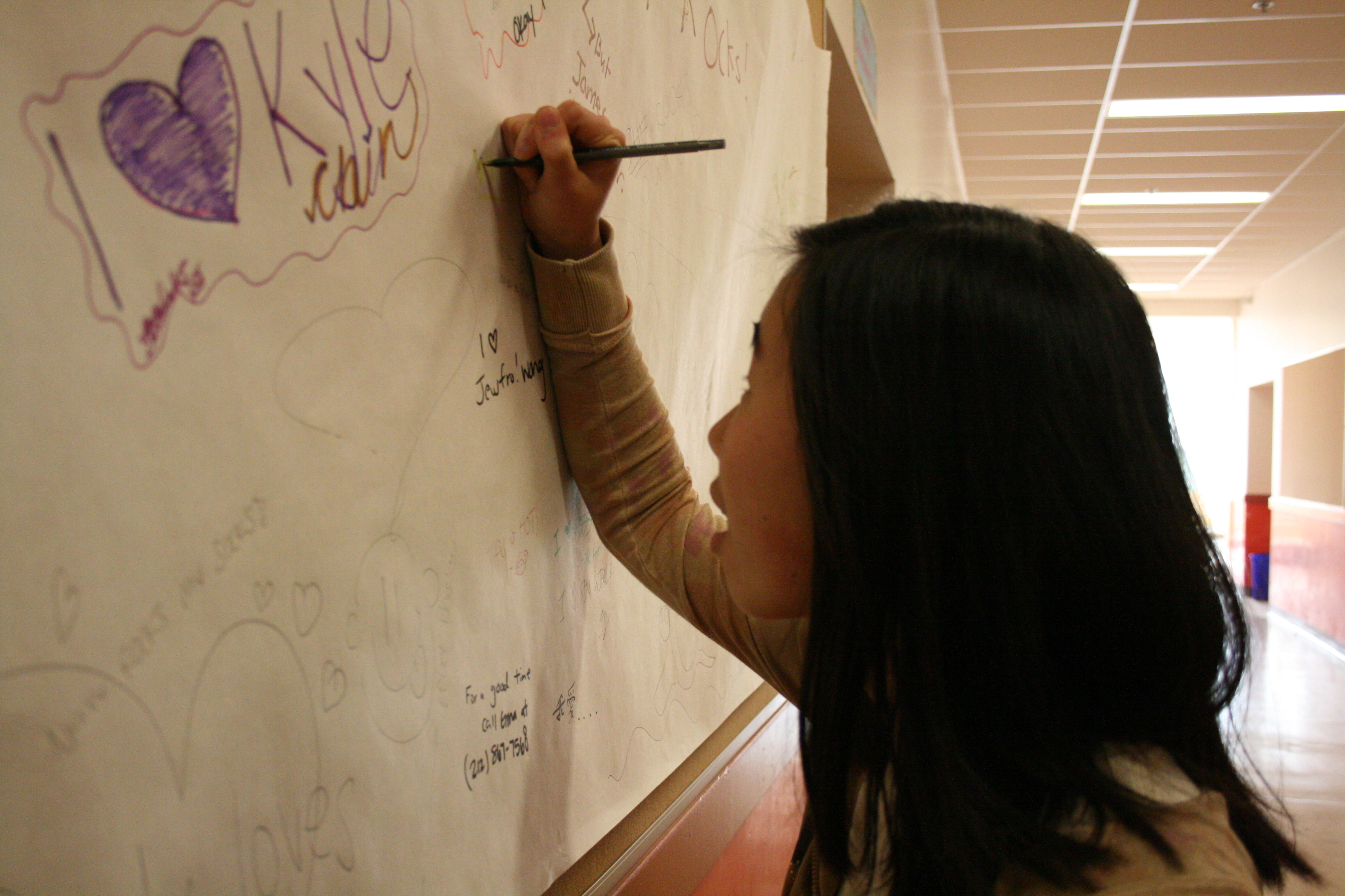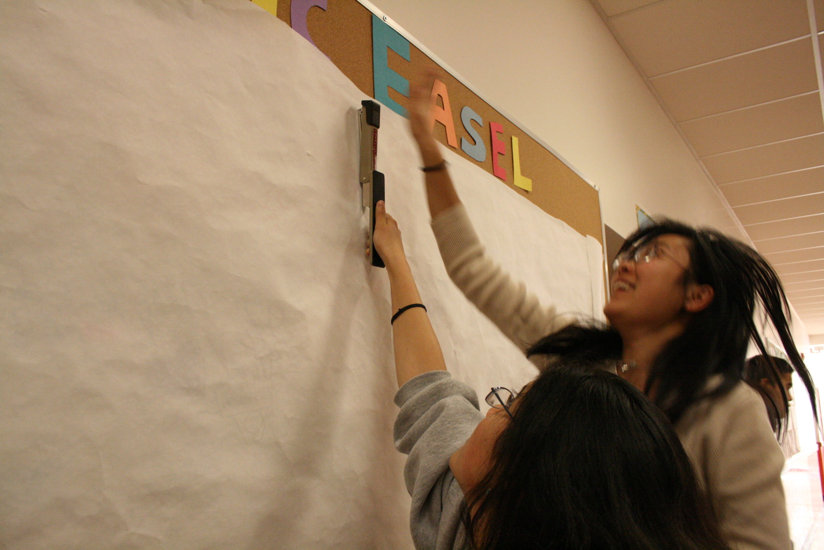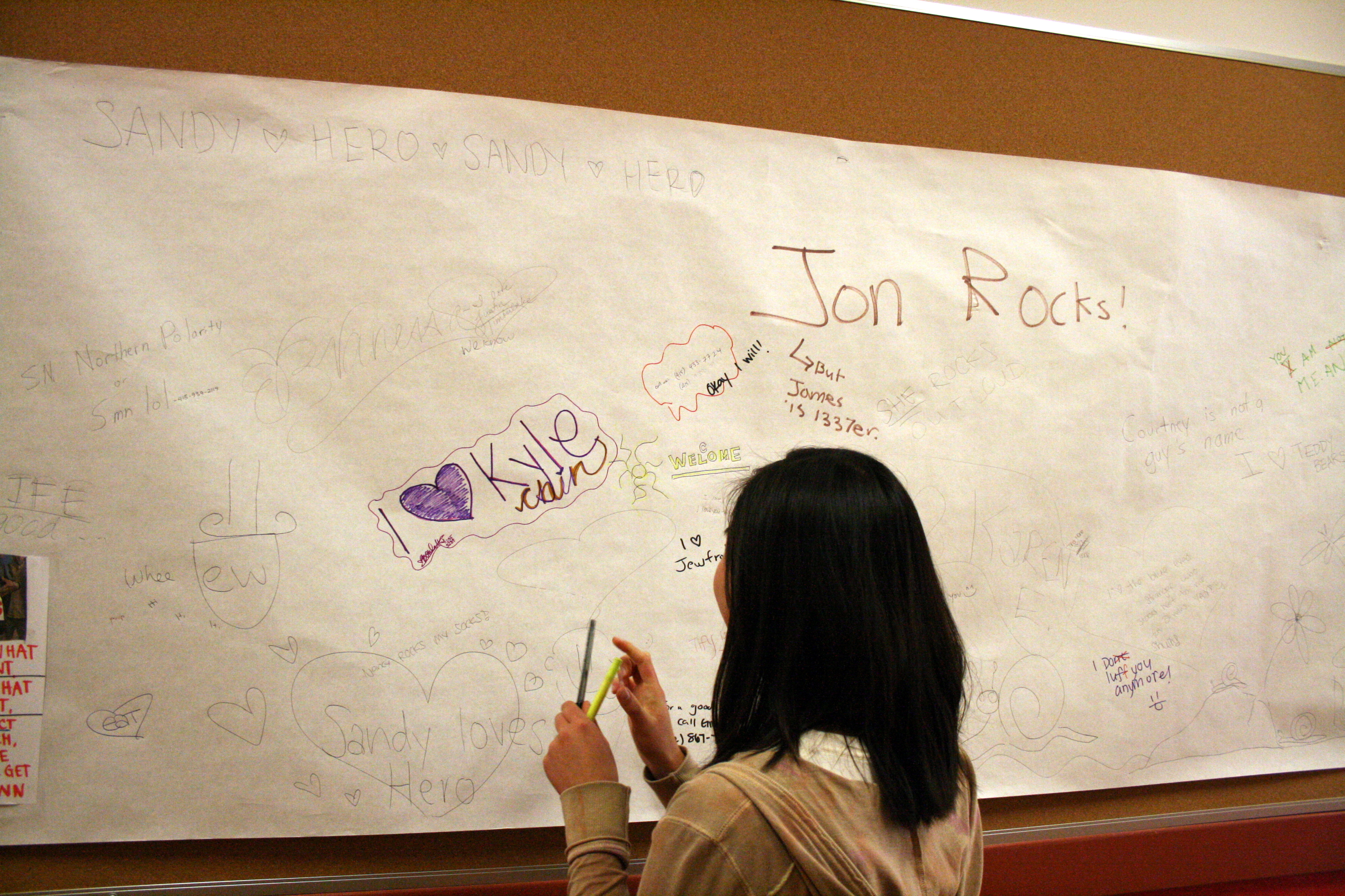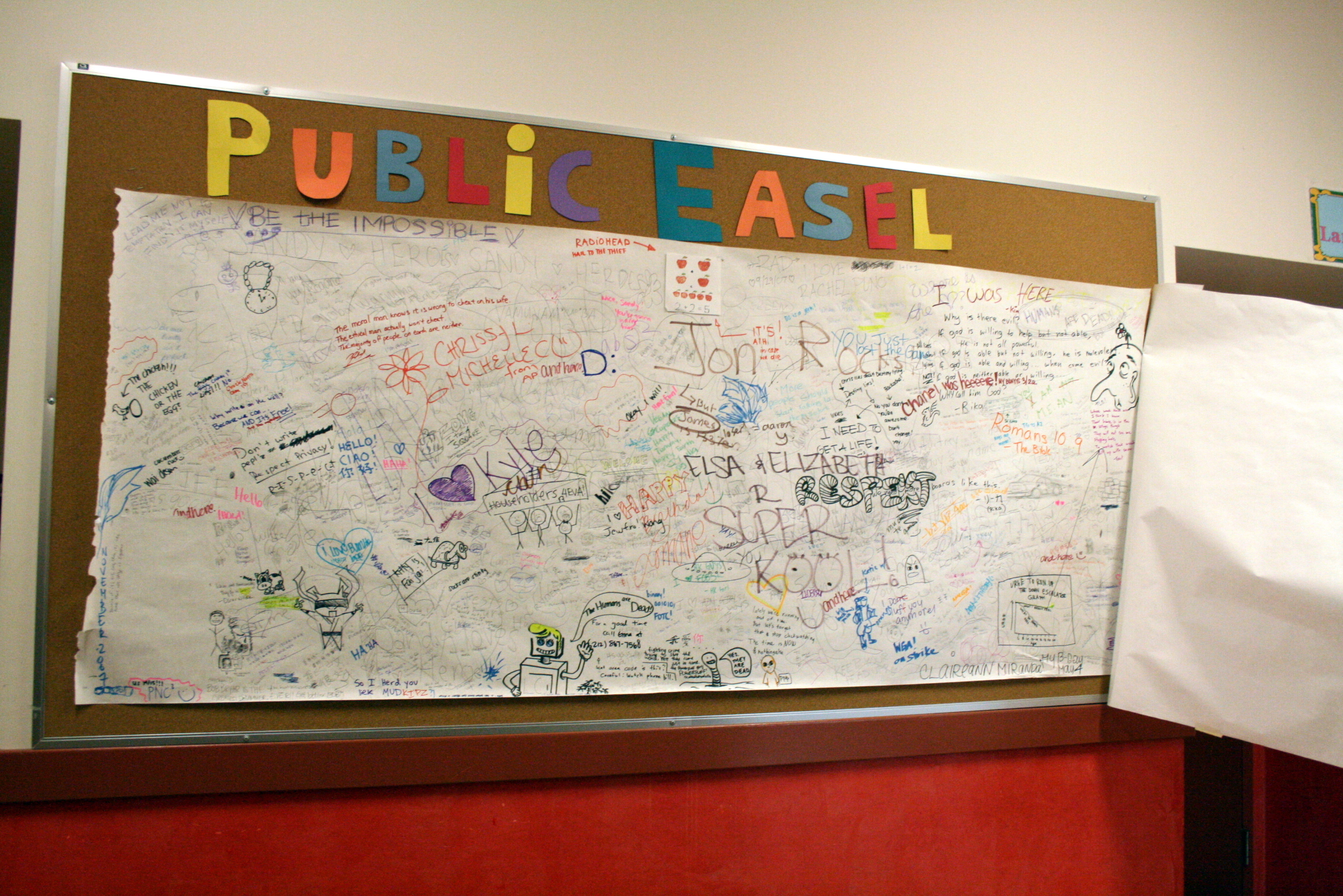 December 1st, 2007 7:38 PMAfter a couple months of bureaucracy, administrators telling us we couldn't do this or that, and the summer passing, Angela and I simply decided to hijack a blank bulletin board in the science wing of our school. We took paper from the gigantic roll in the Peer Resource bungalow and hung it up with rules stating "Write whatever you want, draw whatever you want, but respect free speech, or the board will be taken down." Basically, administrators told me that any obscenity would have to be taken down immediately. We knew about this task and decided to label it "public easel" and see what people came up with.
