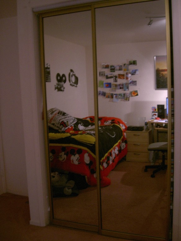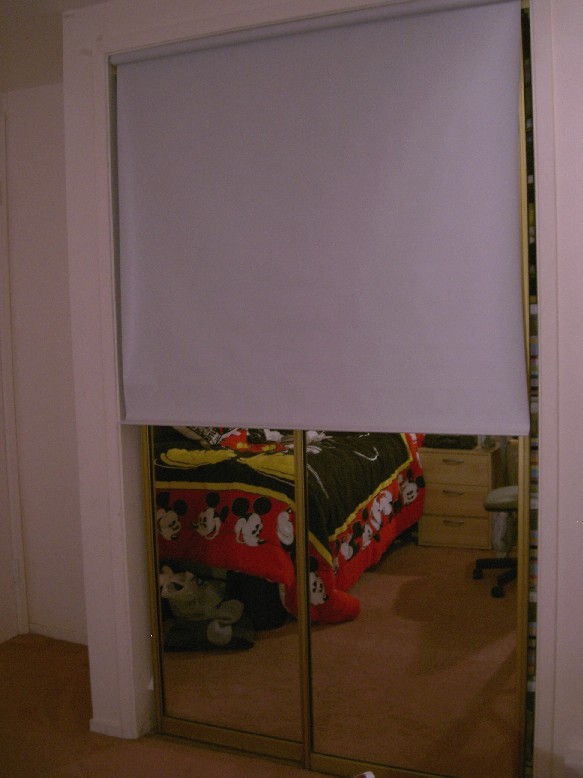 So to cope with that problem, I've decided to use one of those overhead projector screens to cover my mirror. (I wish I actually had a projector so I could project movies the screen and watch them from my bed.)