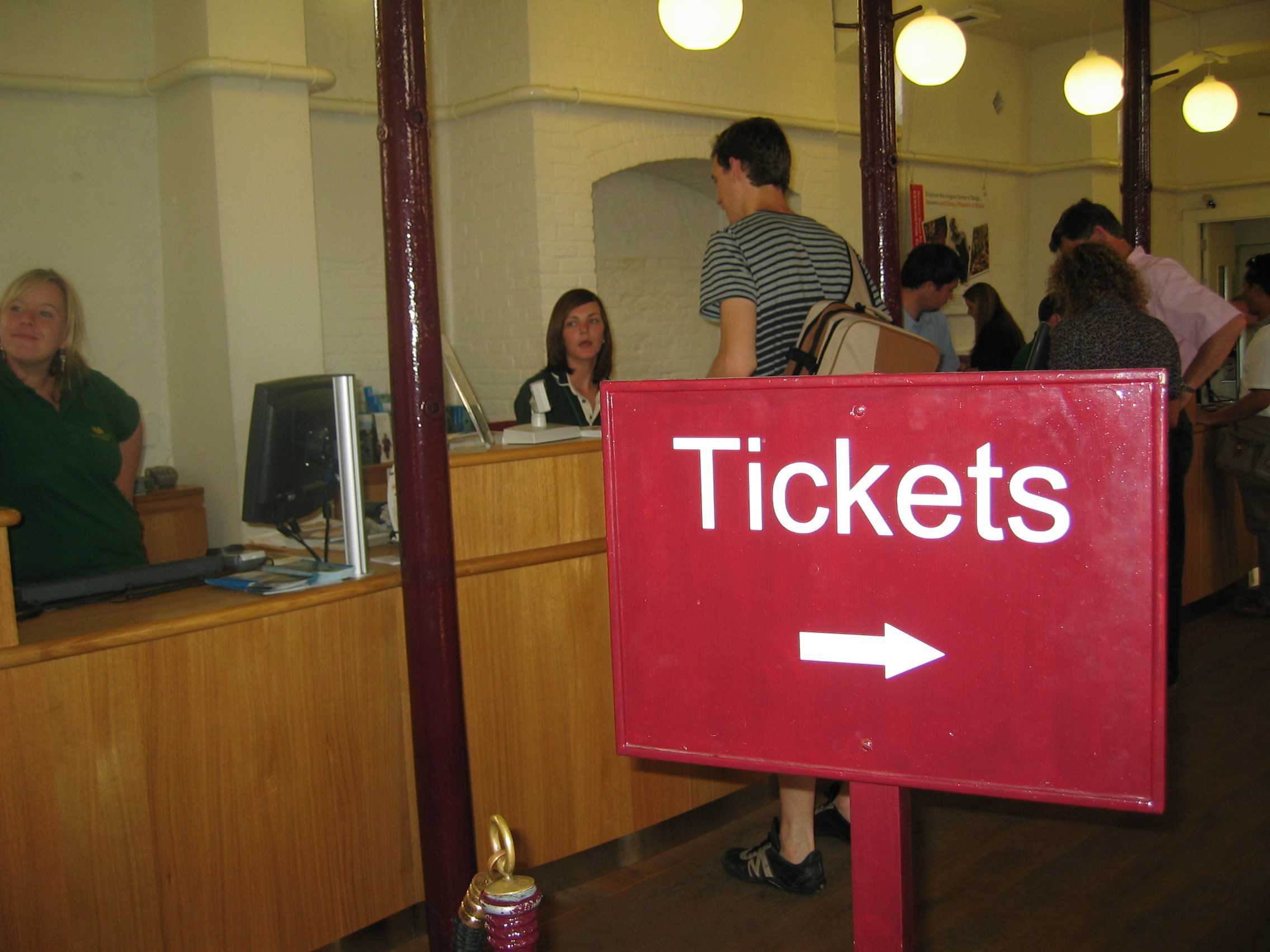 This sign was concreted into the floor, it wasn't just misplaced, there was no ticket desk to the right of the sign, just a wall. The arrow is painted on and is not movable. There is absolutely no excuse for the blatant and unconvincing signage falsehood.