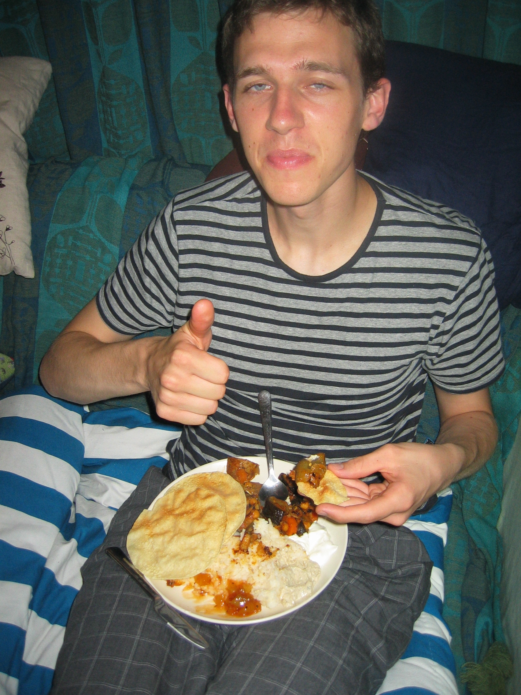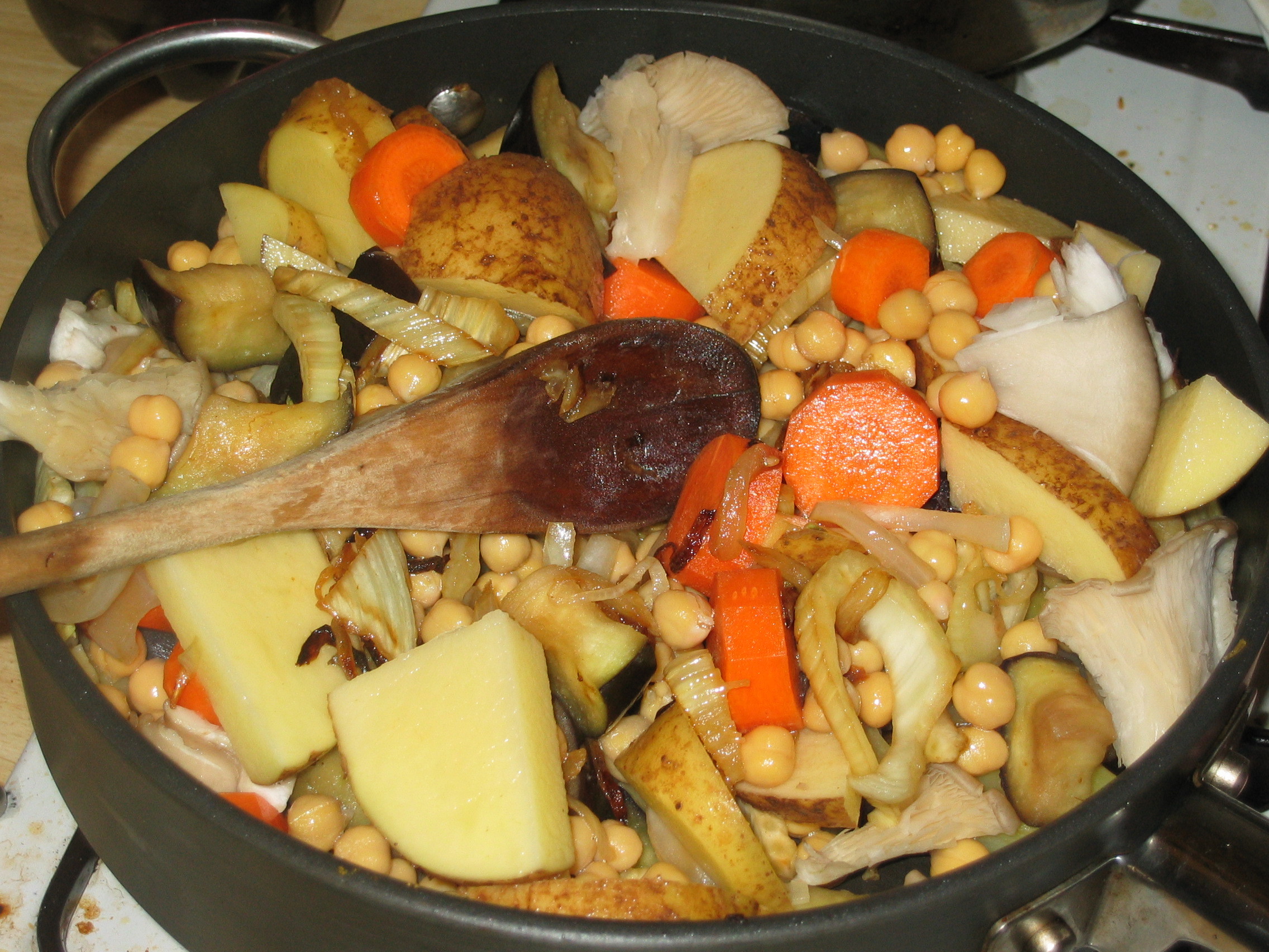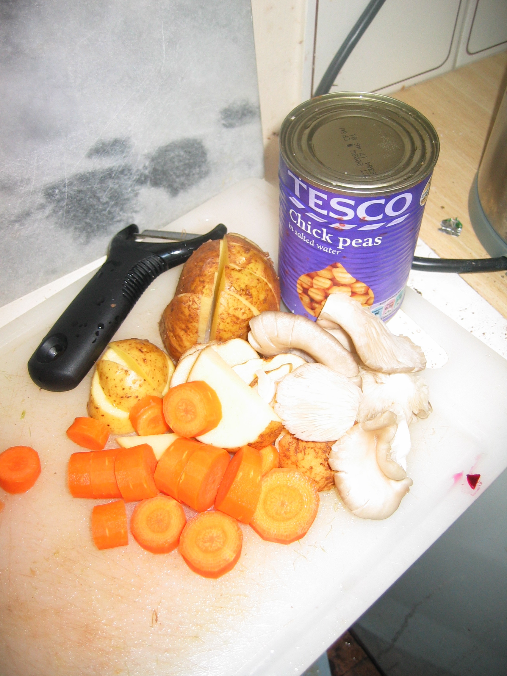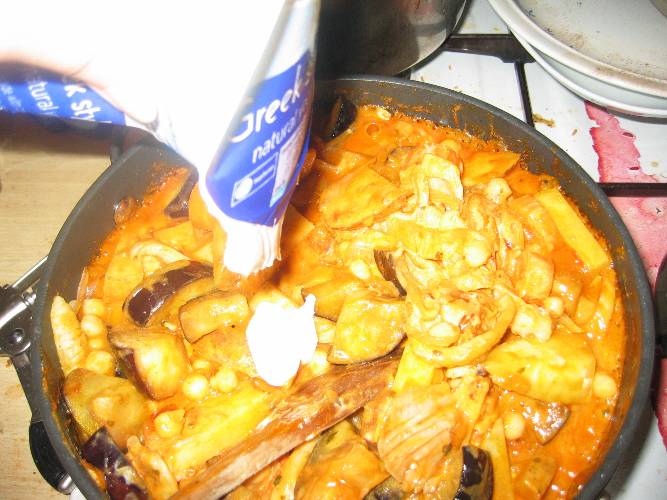 Fry onions and garlic until golden then toss in the cumin. Add mystery veg, potato, carrots and mushrooms and fry for a few more minutes. Add the chickpeas and curry sauce. Simmer until the potato breaks when poked with a wooden spoon (about 30 minutes) stir in yoghurt and continue to simmer for another 5 minutes. (assuming you have forgotten to cook any rice to go with it, like I did)