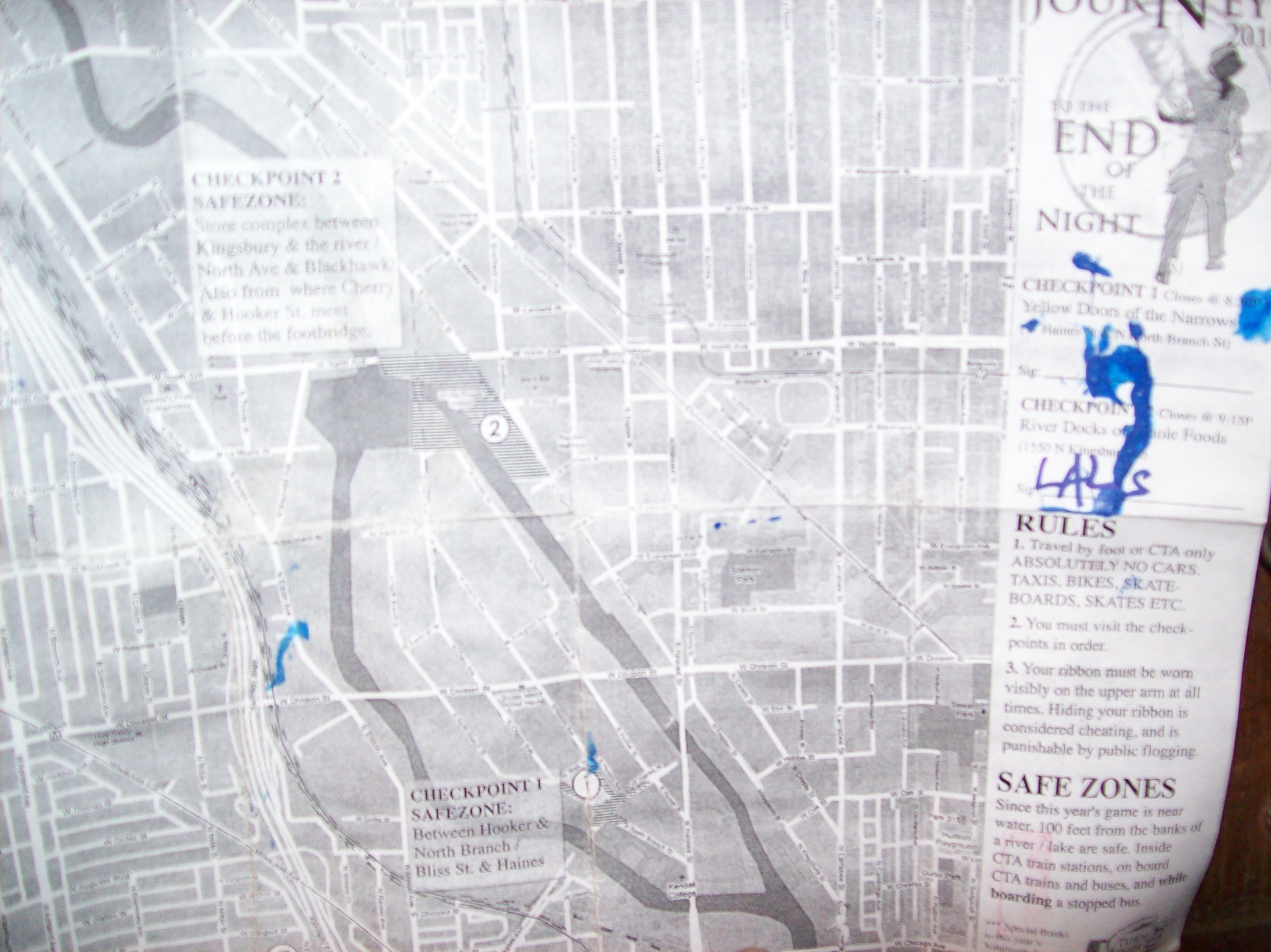 Luckily, the next checkpoints were all much easier to get to. We created poems at the Whole Foods checkpoint, then gave confession at the third. We made it to Oz Park without much trouble, but once there, were at a loss. The park was full of Runners roaming around, calling out to each other. None of us could figure out where the checkpoint actually *was*. After jamming through the last two checkpoints, it felt like we were losing momentum. Eventually we found the checkpoint and then sat down for a well-earned rest. J. passed around a small bag of pretzels, which both satiated our hunger and made us all uncomfortably thirsty.