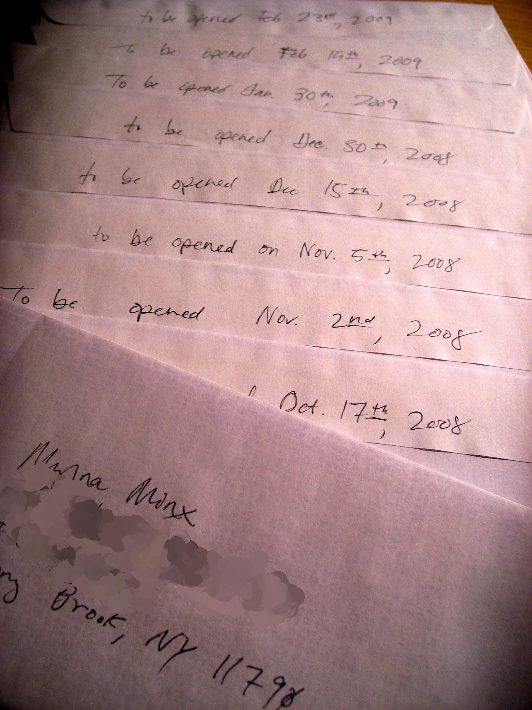 I mailed 10 predictions to myself, the first to be opened on October 14th, 2008, and the last on February 23rd, 2009.