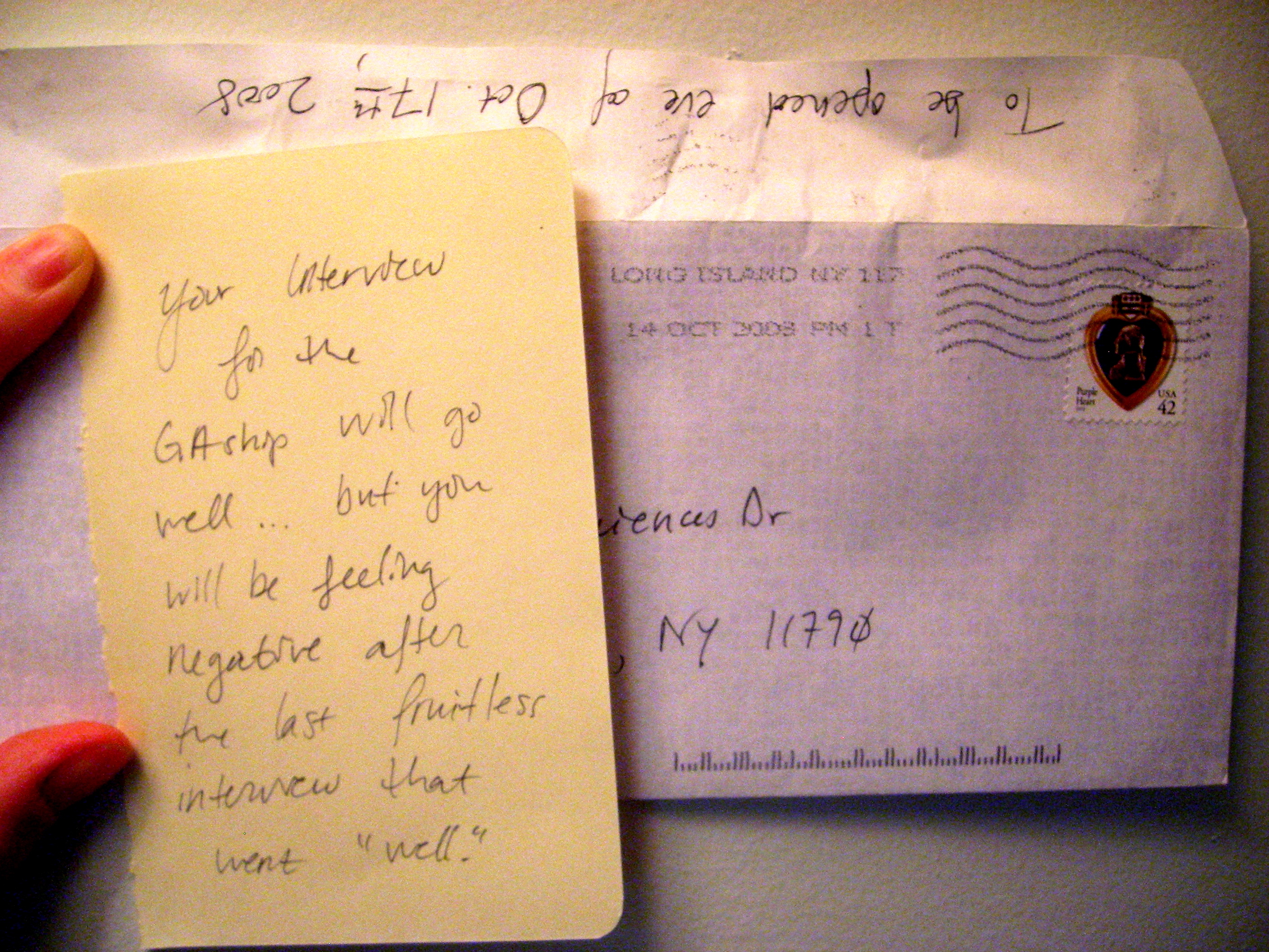 ASSESSMENT:  This prediction was correct.  The interview went very well and lasted over an hour.  At the end, the interviewer informed me that she had interviewed several people and had narrowed it down to 2: someone unknown and me.  All that meant to me was that if I didn't get it, I knew i had just barely missed it.  The last interview I had for another assistantship had gone smashingly- and i had just lost that one to another girl in my department.  My only consolation was that she is actually a bad ass, and I don't mind losing to genuine awesomeness.  So despite the success of the interview, pessimism reigned.  But as you know if you watched the video, i got the job.