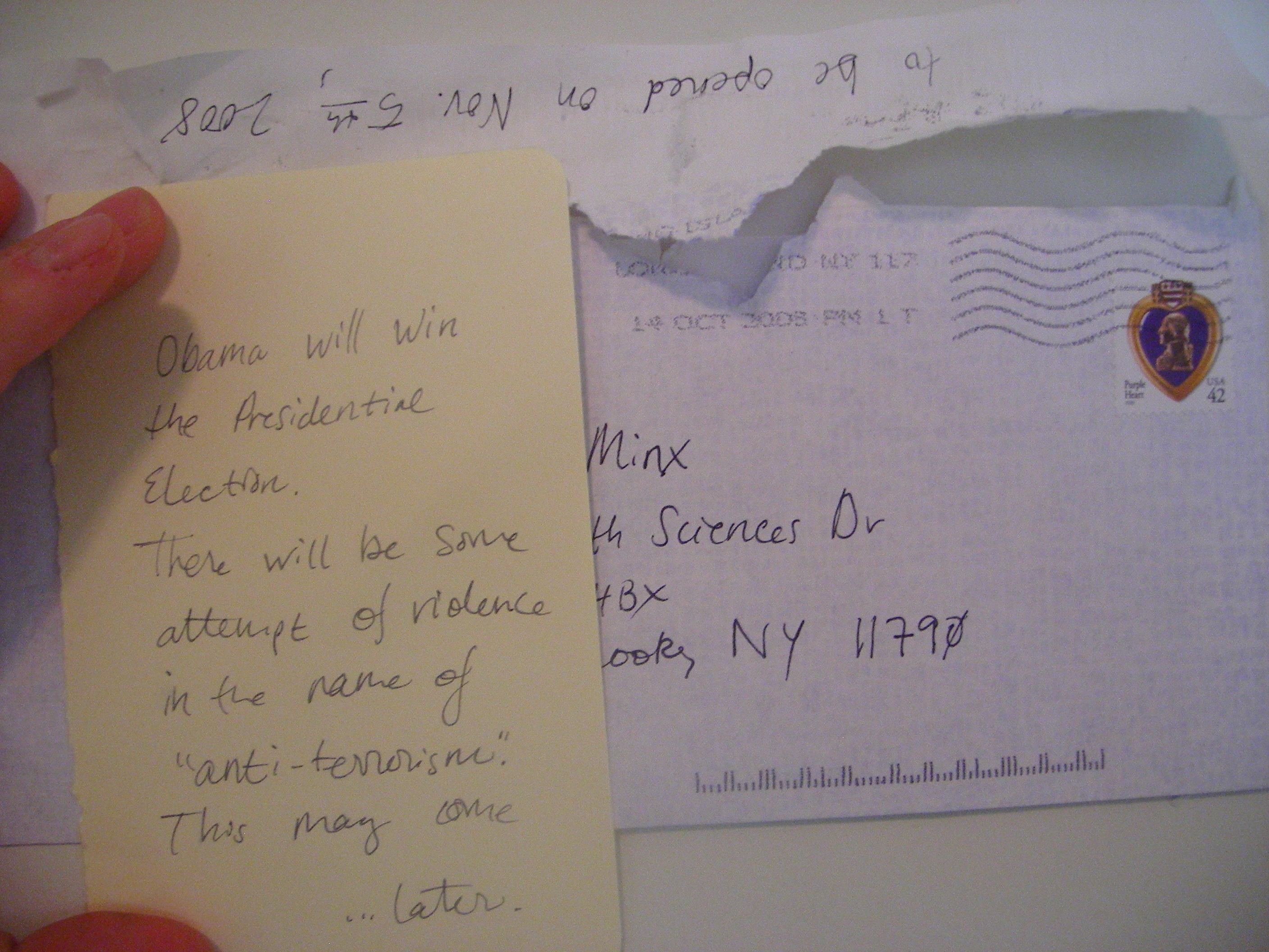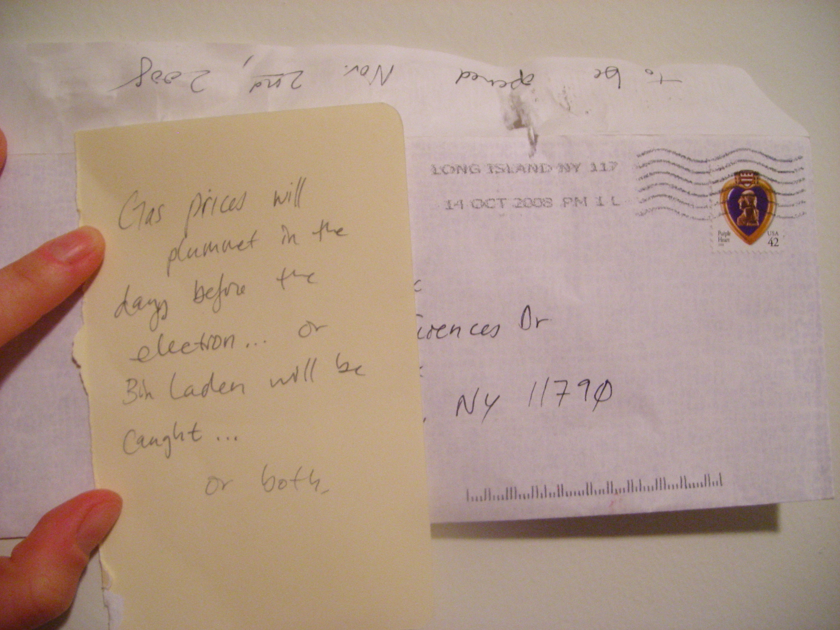 On October 10, 2008, I wrote down a series of predictions and sealed each one in an envelope. The back of each envelope tells of the date that it should be opened. I addressed them to myself, and on October 13th I took them to the post. The postmark of October 14th on each of the sealed envelopes proves that they have been sealed at least since that date. Each prediction will be checked for accuracy as its fated day arrives.