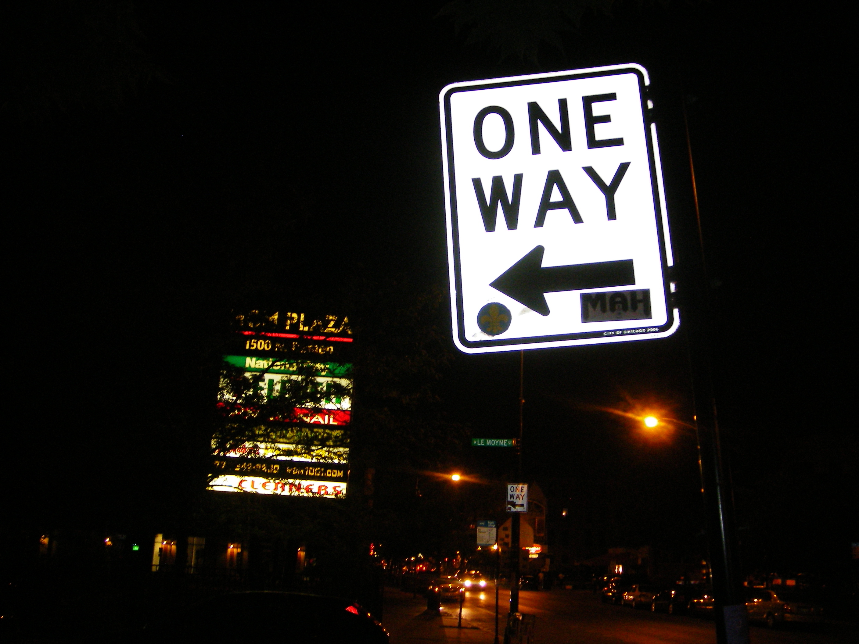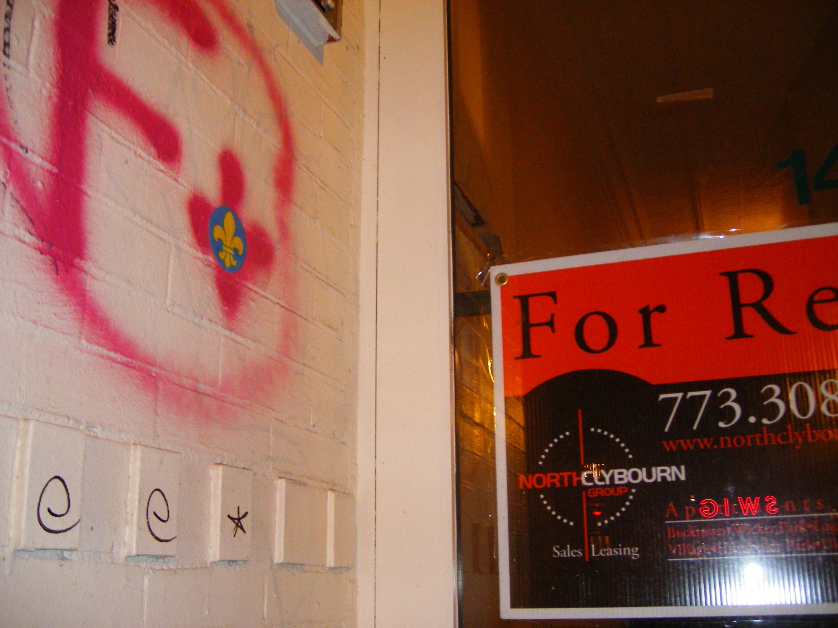 We pasted 23 Fleurs in your city, ChicagØ, but my camera ran out of batteries before we could document the last one. It's on the underside of a flashing sign at 1348 Milwaukee. Perhaps you can find it?