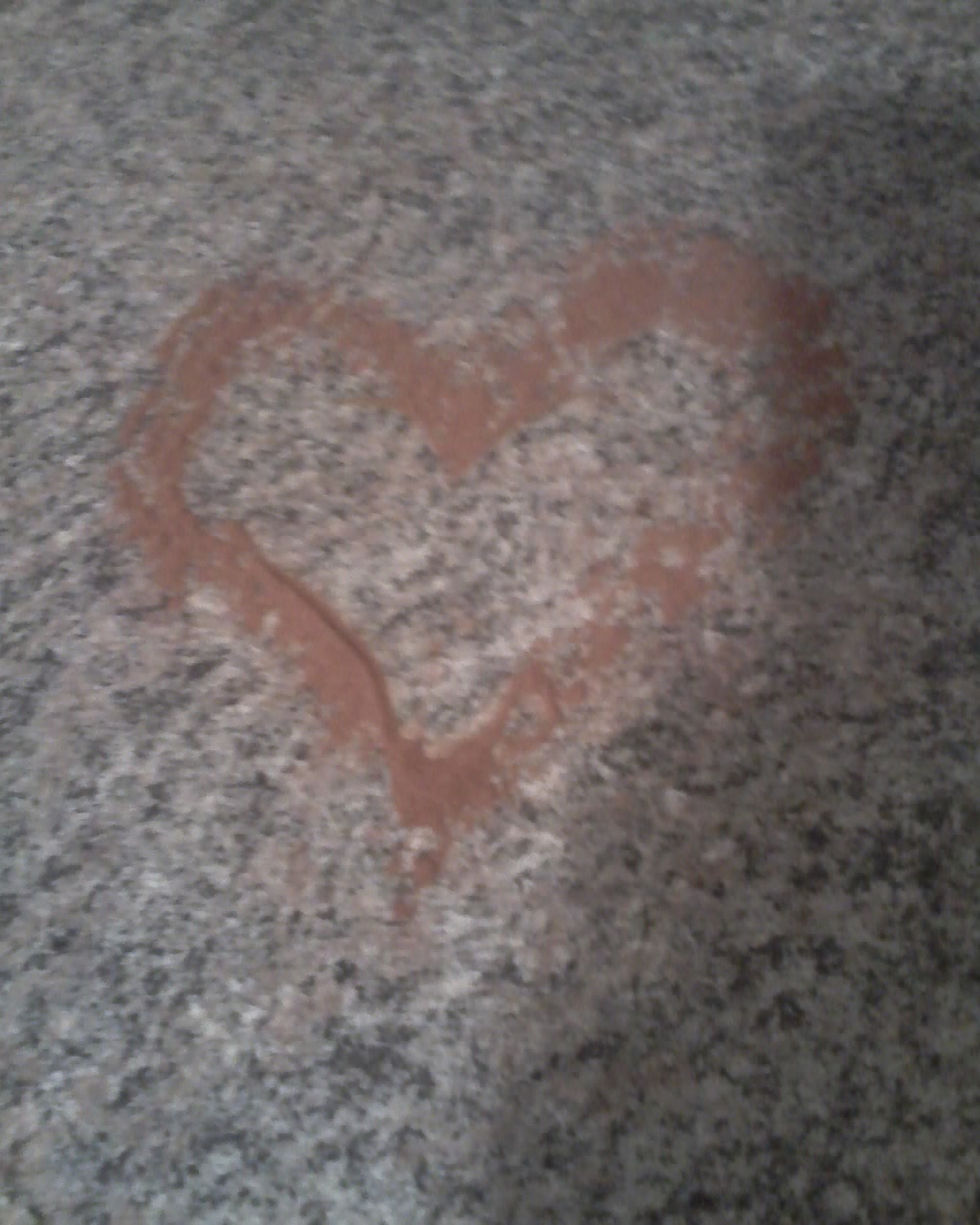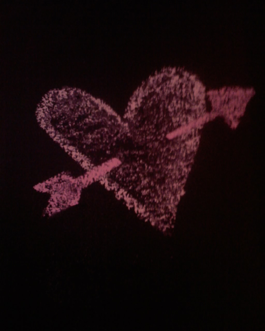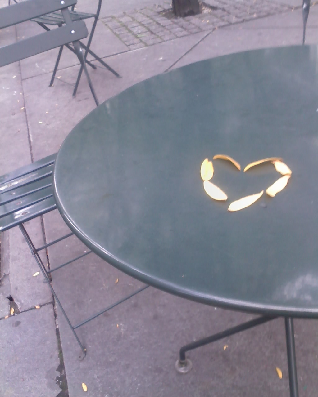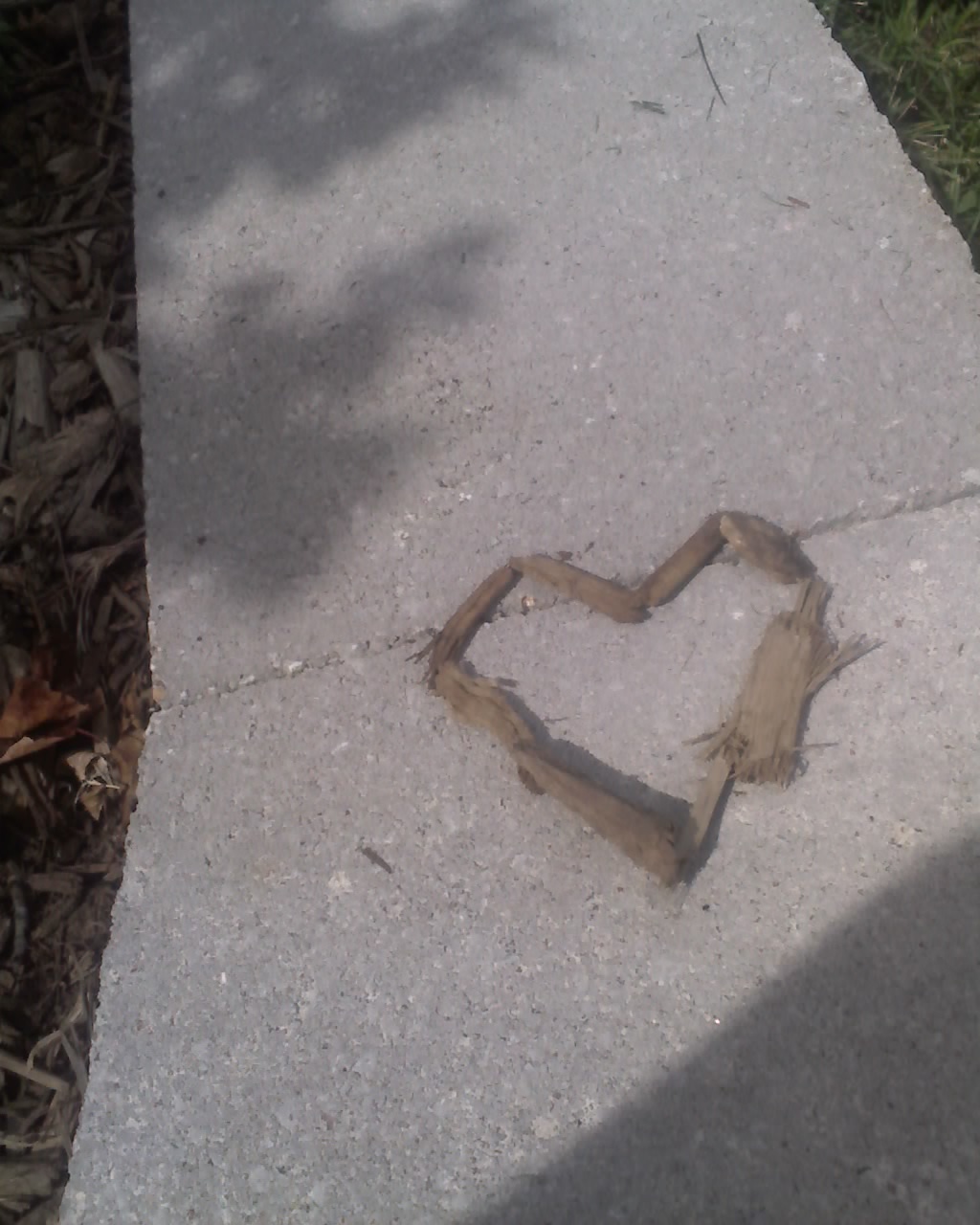 - a heart-shaped stick pin (presented as a gift to me in response to the arrow. The heart shape especially befits the memory of the brief marriage; it was the leitmotif of a series of text-message valentines that we traded from the beginning till the end. A heart traced onto a foggy window, or drawn in water on the pavement. A heart of bright green grass revealed by clearing away a blanket of red leaves just so. The shape of the shadow cast by a wedding ring when placed upright in the spine of an open book. We'd form the clichéd symbol from the ephemera of our surroundings, and send the photograph to the other to say "hi." Now the transient nature of many of our creations seems a portent...)