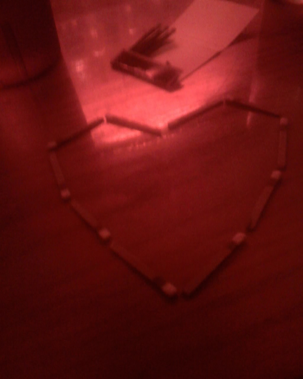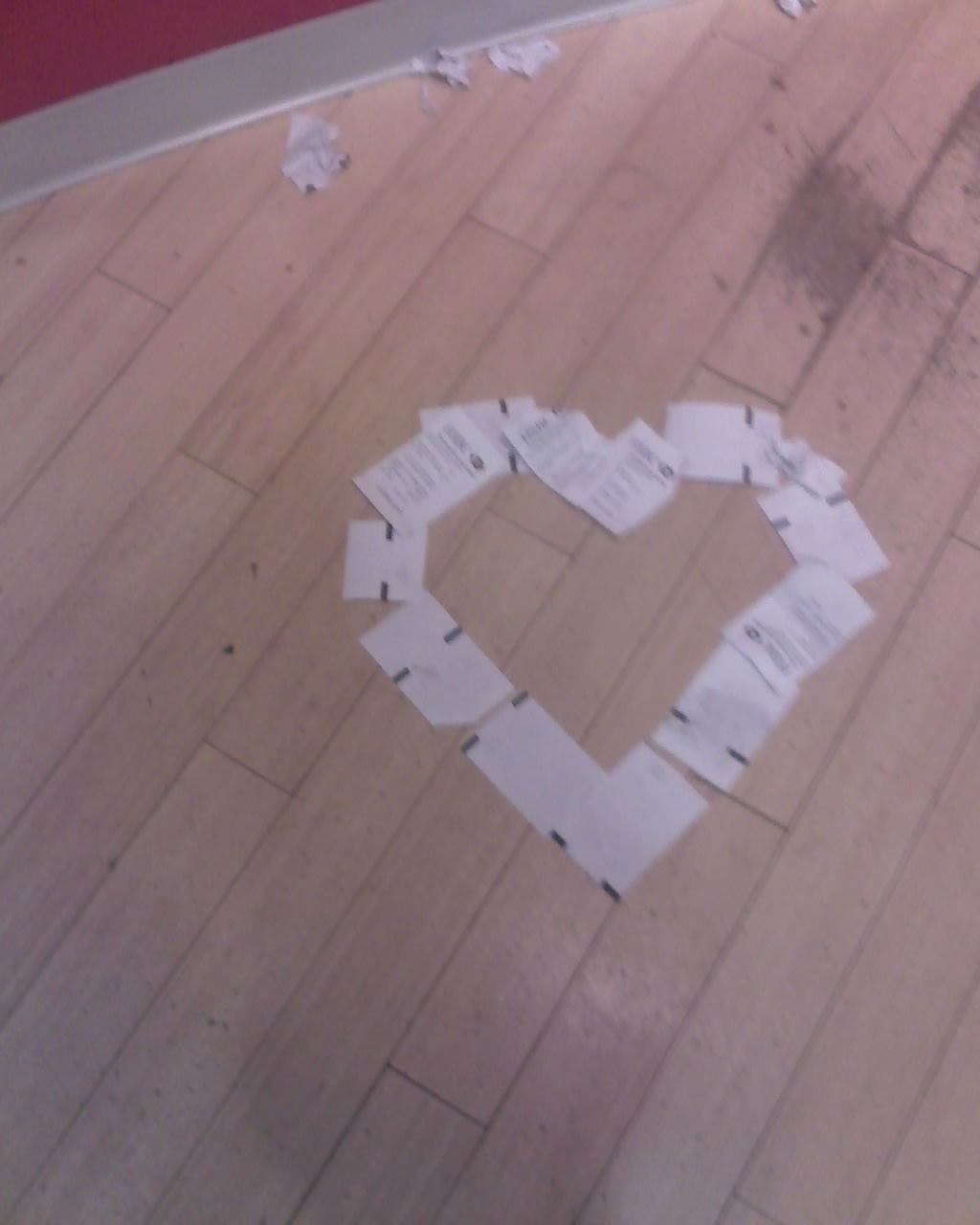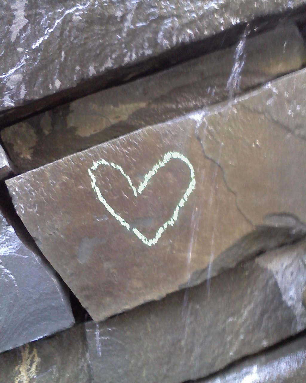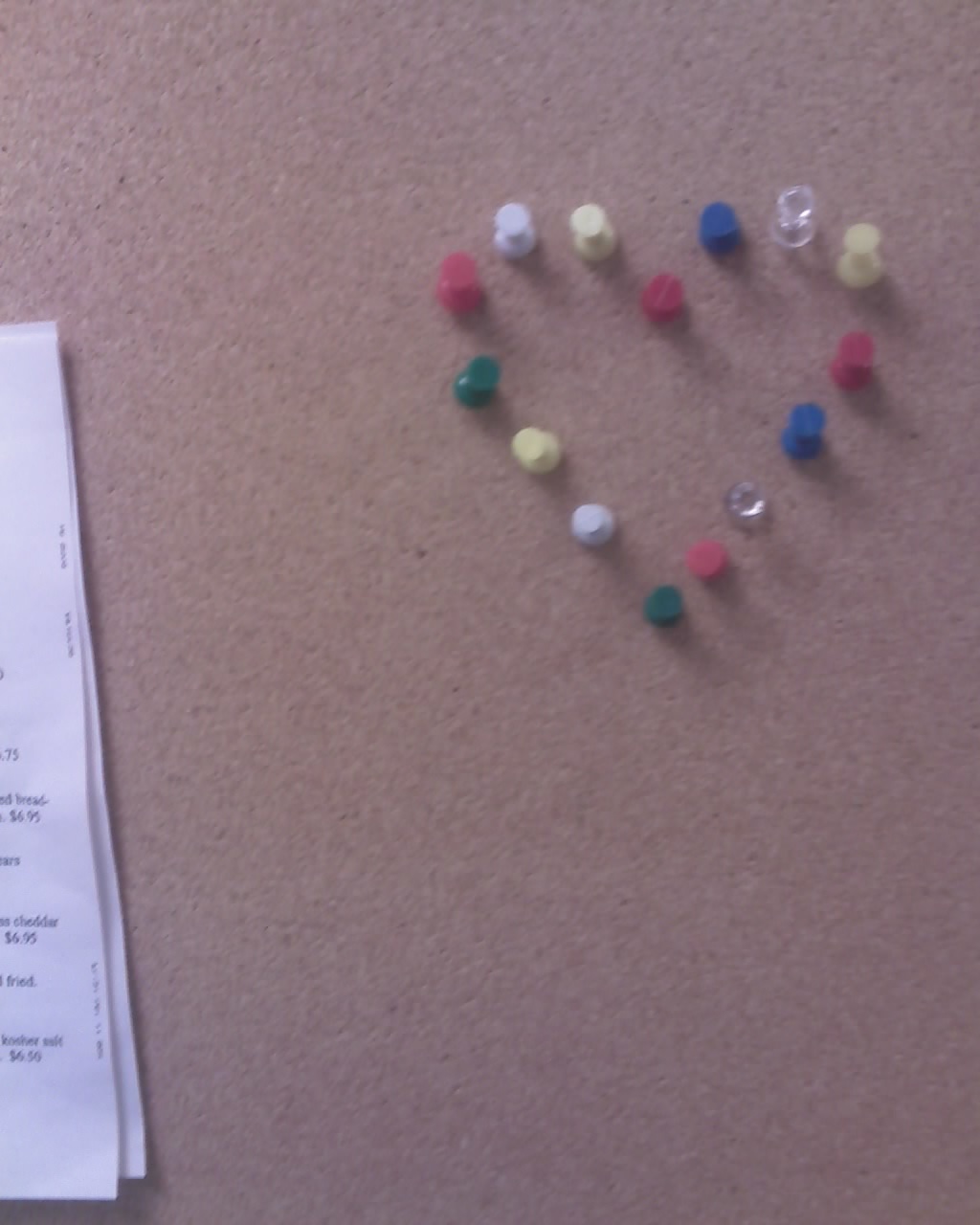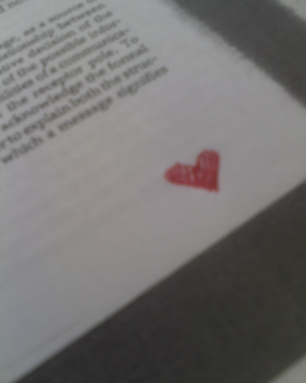 - a heart-shaped stick pin (presented as a gift to me in response to the arrow. The heart shape especially befits the memory of the brief marriage; it was the leitmotif of a series of text-message valentines that we traded from the beginning till the end. A heart traced onto a foggy window, or drawn in water on the pavement. A heart of bright green grass revealed by clearing away a blanket of red leaves just so. The shape of the shadow cast by a wedding ring when placed upright in the spine of an open book. We'd form the clichéd symbol from the ephemera of our surroundings, and send the photograph to the other to say "hi." Now the transient nature of many of our creations seems a portent...)