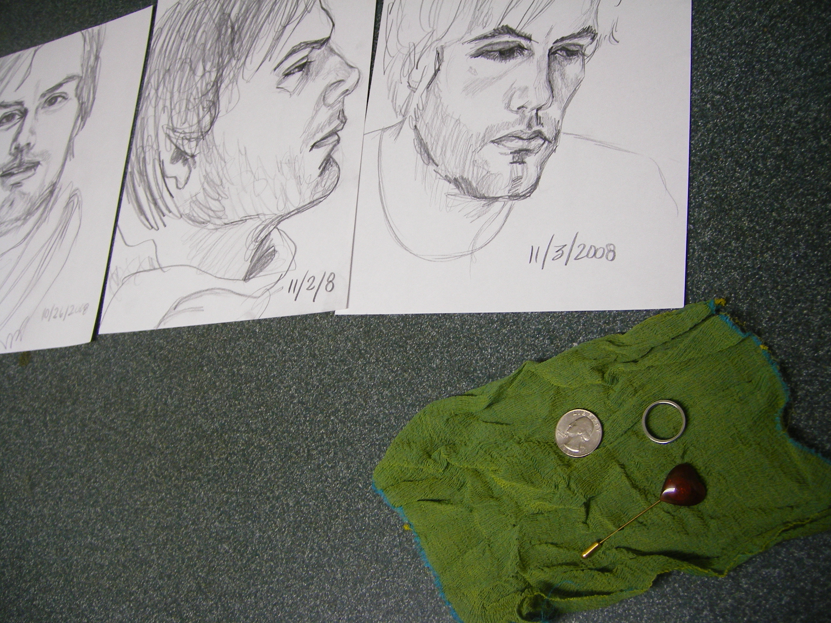 I tried to draw my husband for a few minutes every night. I thought about adding these sketches to the collection of objects, but decided against it in favor of a compact and elegant bundle that would be more resistant to the elements.