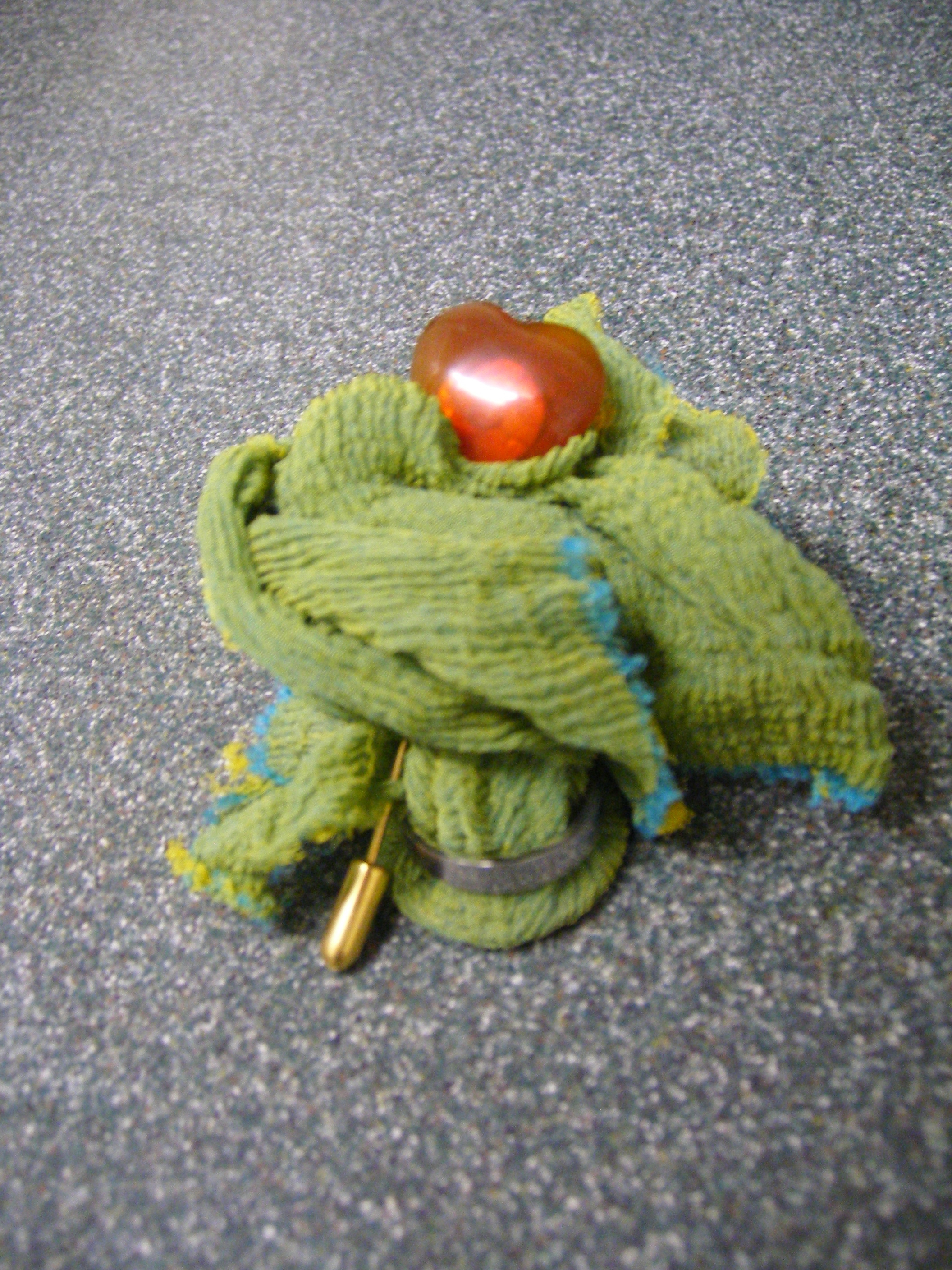 - a square of gauzy green fabric (originally held potlatch treasure from Dela Dejavoo, it was recycled in order to present a gift to him the first time he asked me to dinner. The gift was a lapel pin in the form of a golden arrow. He said receiving that silly gift made him fall in love with me)