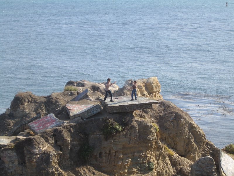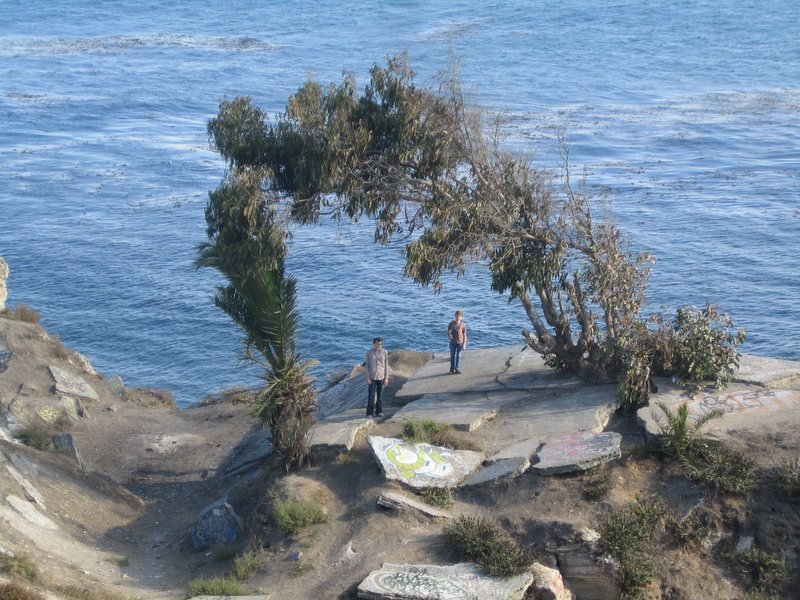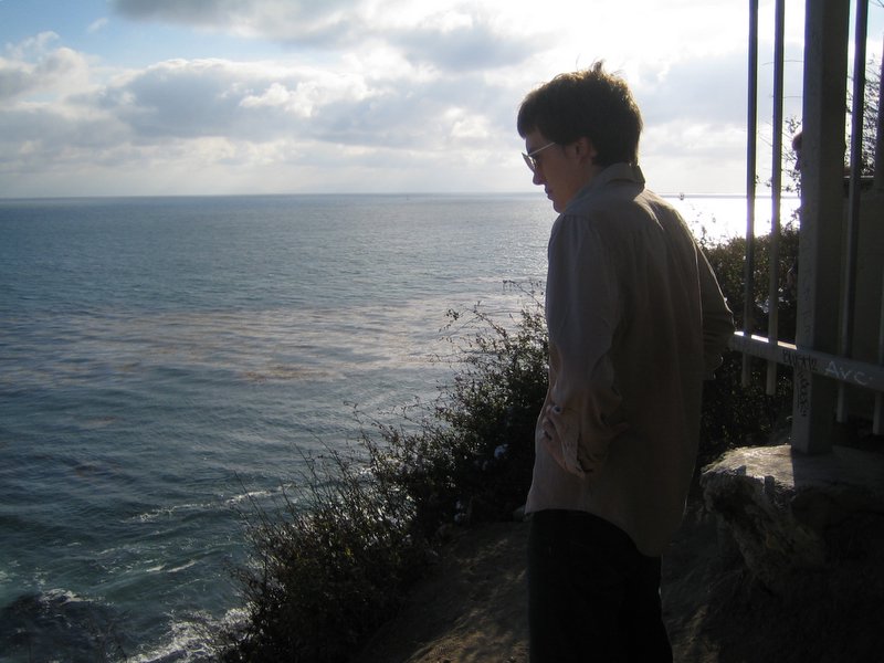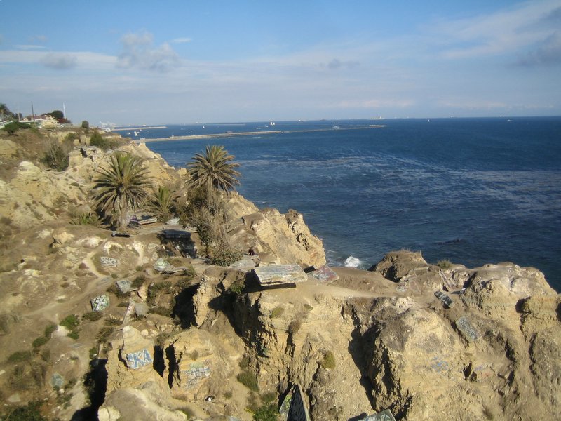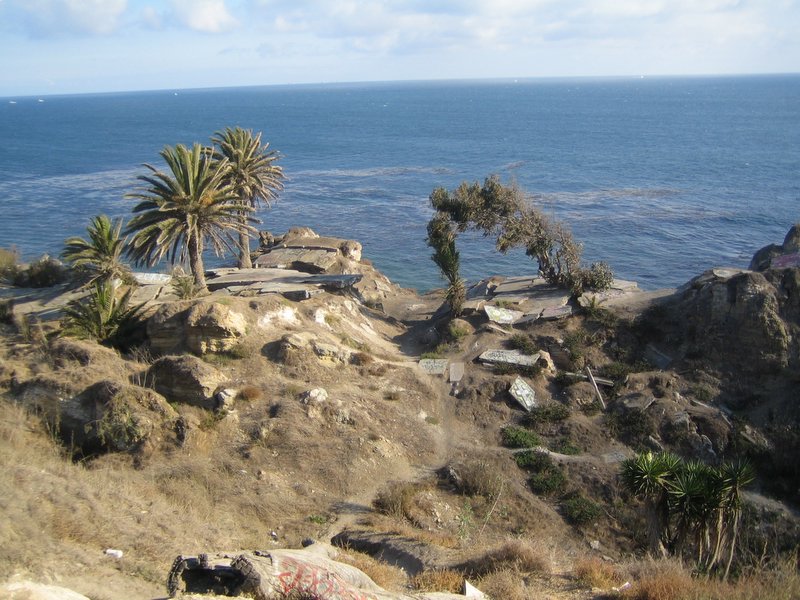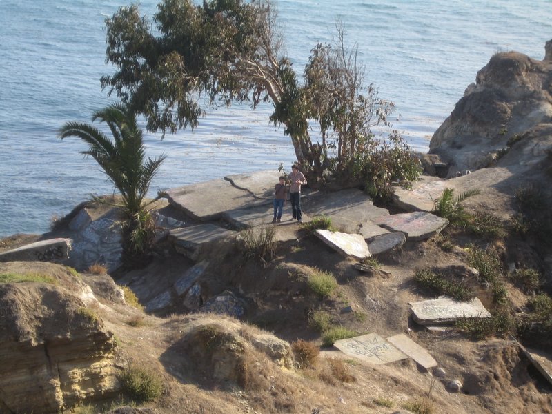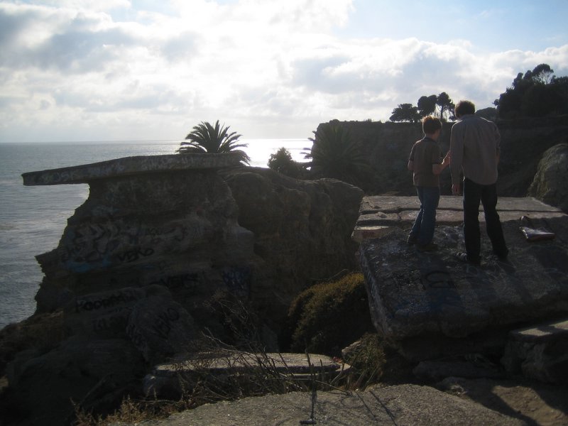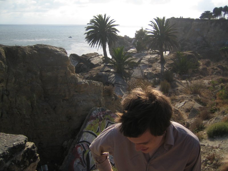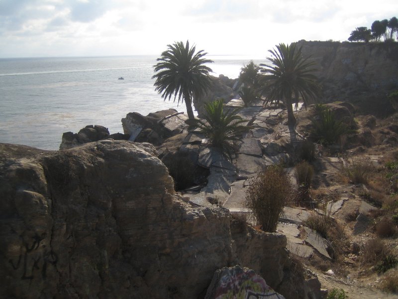 About three weeks ago, during my trip to Irvine, Joe drove Yoshi and me to the crumbling L.A. surburb of San Pedro. In the 1920s, sections of this coastal town began to fall into the sea at a rate of almost a foot a day. The affected area is blocked off by a fence, but Joe, Yoshi, and I slipped through an opening and found ourselves in an otherworld of modern ruins. The ocean ate voraciously, and what's left now looks like the aftermath of some sort of failed geological experiment. Huge flat slabs of concrete sit atop decaying earth at odd angles and random trees spring up in the recesses of the cracked and shifted sidewalks. Broken bottles and graffiti cover a lot of surfaces, but that somehow added the beauty of what we saw that day. It was incredibly clear and quiet, the ocean was as blue as I've ever seen it, and I felt like I was a citizen of the future, on a tourist's trip to the ruins of the twentieth century.