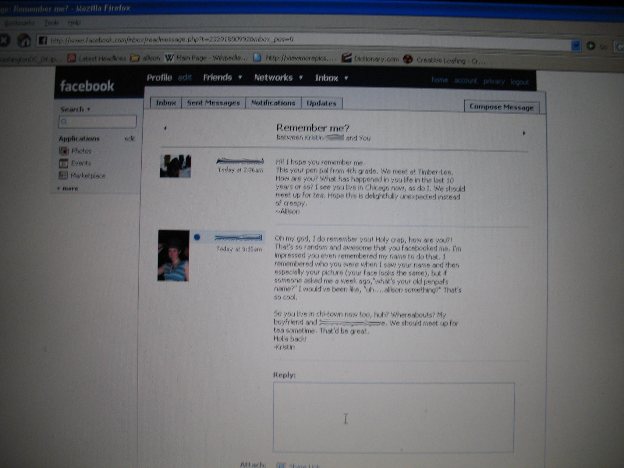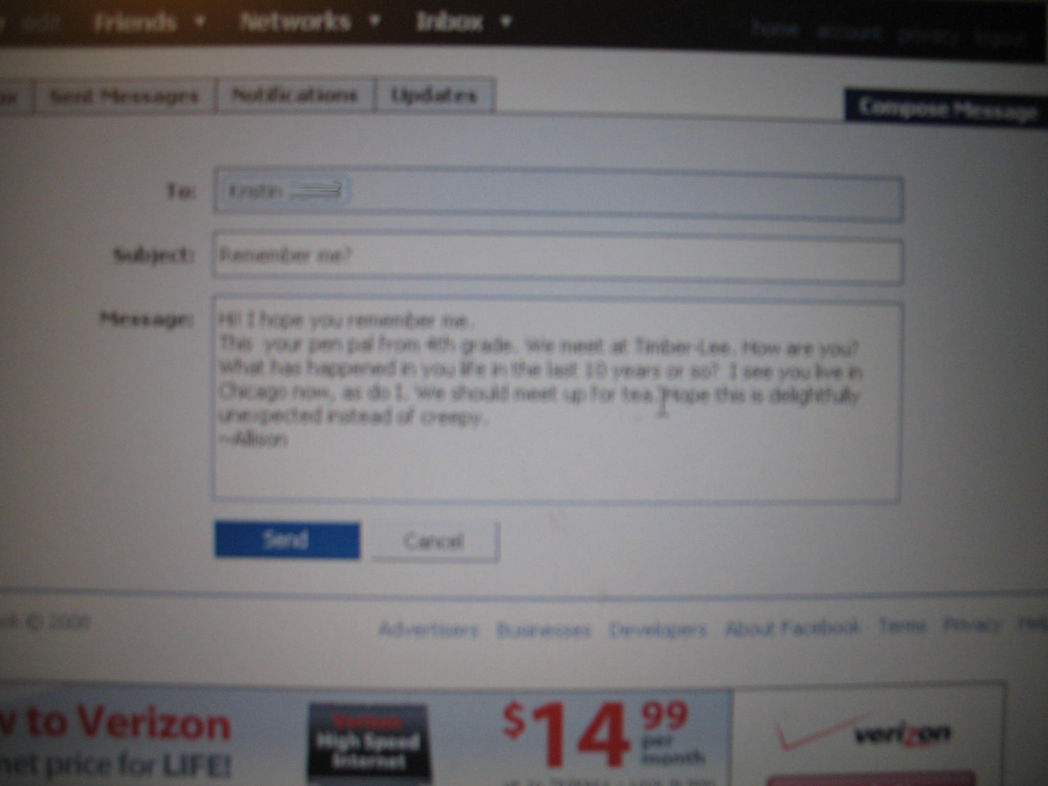 In Fourth Grade I met my friend Kristin at Summer Camp. We didn't live near each other so we decided to become pen pals, although both of us being woefully unspectacular at wrighting consistantly we managed to send the occasional letter and managed to stay in touch much longer then any other ill fated penpal attempt of the past. Twards the end of junior high/ begining of highschool we lost touch for good which saddened me greatly. But using the aid of unfortunitly lame, but very useful facebook I was able to stalk...er um... track her down and wright her a note suggesting we meet up and continue our pen pal status. I've not heard a reply yet, but I'm pretty excited.