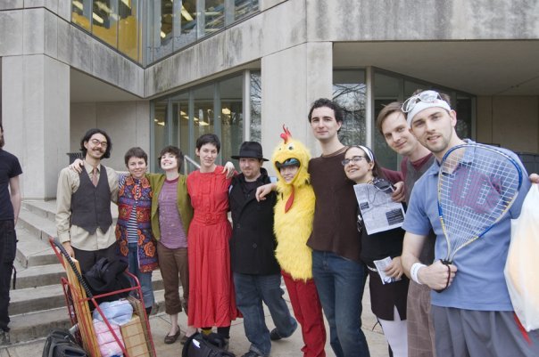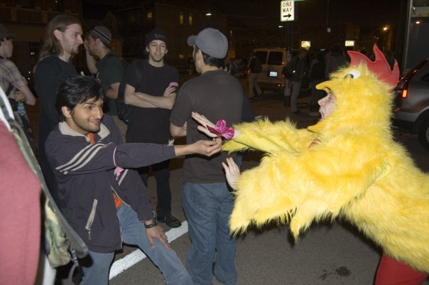 we were stationed after check point two, at Roosevelt and canal. which was great, since everyone had to pass though that point we got to see a lot of runners come through and scare the shit out of a great many of them. Some people saw a girl in a chicken suit and realized it was part of the game immediately and started running, while others were rather dumbstruck by the spectacle and didn't realize I was a chaser till I was only a few feet away. One guy I cornered behind a car in a Dominicks parking lot and we stood staring at each other for quite a while. behind the fence there was a homeless man who thought the entire situation was hysterical. The whole time he was laughing and saying things like "she's got you boy!" he made a break for it and I was in hot pursuit. I wasn't letting this one go. I proceeded to chase him up and down the block around buses and back and forth to different sides of the street the whole time the man at the fence busting a gut. He finally ran out of steam and I collected a very well deserved blue ribbon, as well as a high five from our amused onlooker as well as a high five from two security guards who had observed the scene. There was another girl who once separated from her friends ran into a kinkos and stood helplessly at the door as she watched me bike up to the door open it and tag her. she put up her hands and handed over her ribbon as she said " I was really hoping you weren't aloud to tag me if I was inside" One of the best moments of the evening was when a runner darted into Walgreens I feeling particularly stubborn at the moment and not wanting to abandon my bike, just took it in with me. but decreced maneuverability of a bike around tight isles and mirrors which aided him in knowing my location was against me. It did however take the clerk a good minute and a half to ask me to leave the store. My target remained in the store and I was thwarted. I yelled out as I was leaving that he couldn't stay in there forever. While I was waiting for more runners he stuck his head out the door and yelled at me " Hey big bird!" stuck out his tongue and darted back in the store. He made it away when i was chasing other prey. there was one guy who I ended up chasing 3 or 4 times, which I'm not sure how that happened, but he was so damn determined that I gave him a good final chase and sent him on his way. But the best catch of the evening from our team goes to rob, who (dressed as an egg mind you) caught someone in the produce section of dominicks! At the end of the evening I had caught 6 Rob had caught another 3. we decided to go to the rest of the checkpoints and give a good scare to anyone along the way. we met up with many lovely people and got to hear about others journeys of the evening.