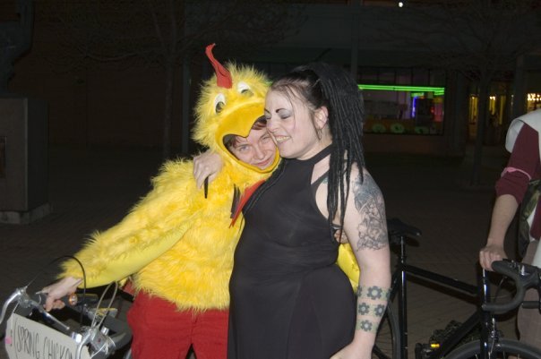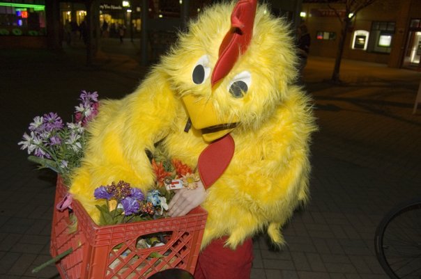 So last year, I had chased as Beetlebomb, which was the introduction of this persona, and as much fun as it is, I wanted to do something different. Having obtained a children's chicken suit for my Puns of the naverone completion, I wanted to make as much use of it as possible. the fun part was trying to fit my bike helmet under the chicken head. which was a little tight, but it worked. A few weeks earlier I had dumpstered a ton of fake flowers, and had not yet found a purpose for. I decided to put them in the basket on the back of my bike therefore becoming the "Spring Chicken". Dax assisted me in making signs for the front and back of my bike. As Rob had previously assisted me as dressing as an egg, (and as it is a shame to waste a perfectly good egg costume) he aqueoused and donned the apparel once more and we made a team of it.