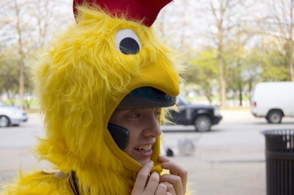 I discovered I could talk on my cell phone by wedging it between the chicken mask and my face which freed up arms for biking, i was pretty stoked.