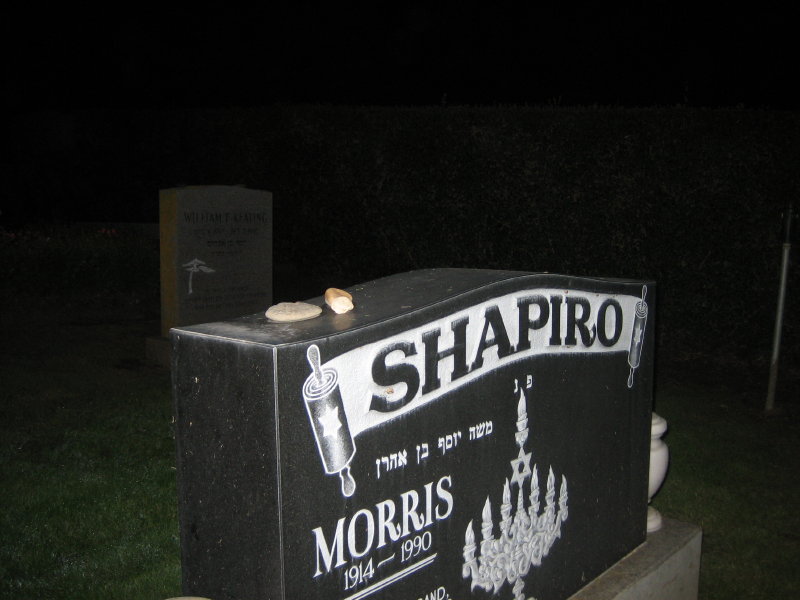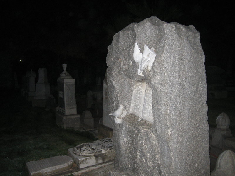 Cam: Having located his grave, and then purchased a uke, and two nose flutes (more on that later), we proceeded to the Hills of Eternity Cemetery. There was no guard of any sort. You could walk right up into the pitch black fields from the road. The cemetery was actually two divided by a central road. I knew only that Wyatt was buried in the Jewish section; but to my surprise, the whole cemetery was Jewish. The only thing to do was explore the whole thing.