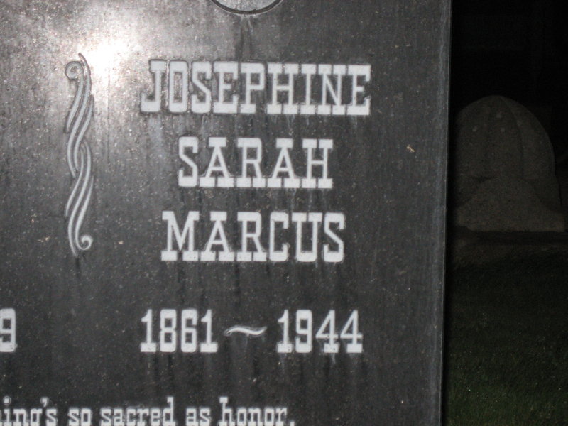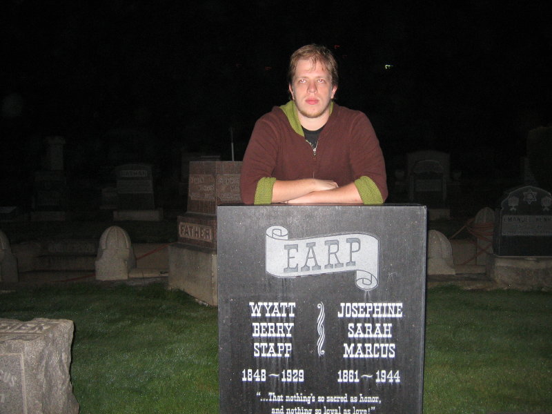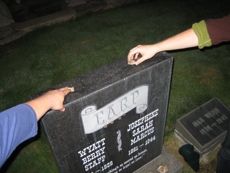 Orion: Having no particular sentiment for Wyatt Earp (my only real impression of him is Kurt Russel’s over-the-top ruffian exterminator in Tombstone) I was along simply for the thrill of it. Finding his gravestone in Colma seemed an unbelievably difficult proposition—there were thousands of graves in seemingly haphazard arrangements and all we knew was that his headstone was black. Great…and my night vision is bad enough that even Cam would spook me at times.