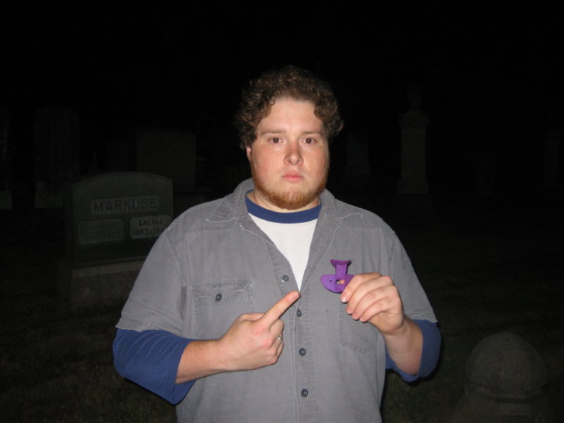 Cam: When we had reached the back of the cemetery, we began to walk back. Suddenly, we heard a sound like keys clanking in a pocket. We ducked and crouched silent for many moments. The sound continued, but it stayed in place. Eventually we ventured toward the sound, and found a small metal and glass pinwheel mounted permanently to the grave of a very young girl. It was spinning and clanking in the breeze.