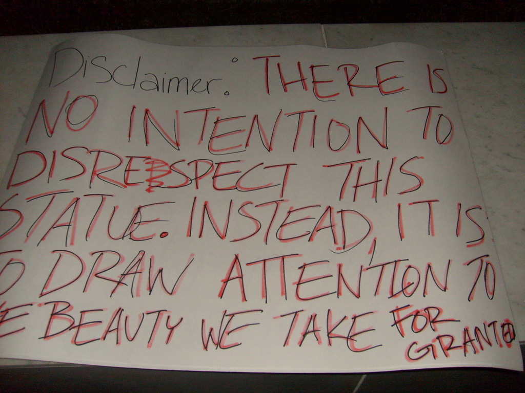The snippy little disclaimer to keep admin happy: "Disclaimer: There is no intention to disrespect this statue. Instead, it is to draw attention to the beauty we take for granted."