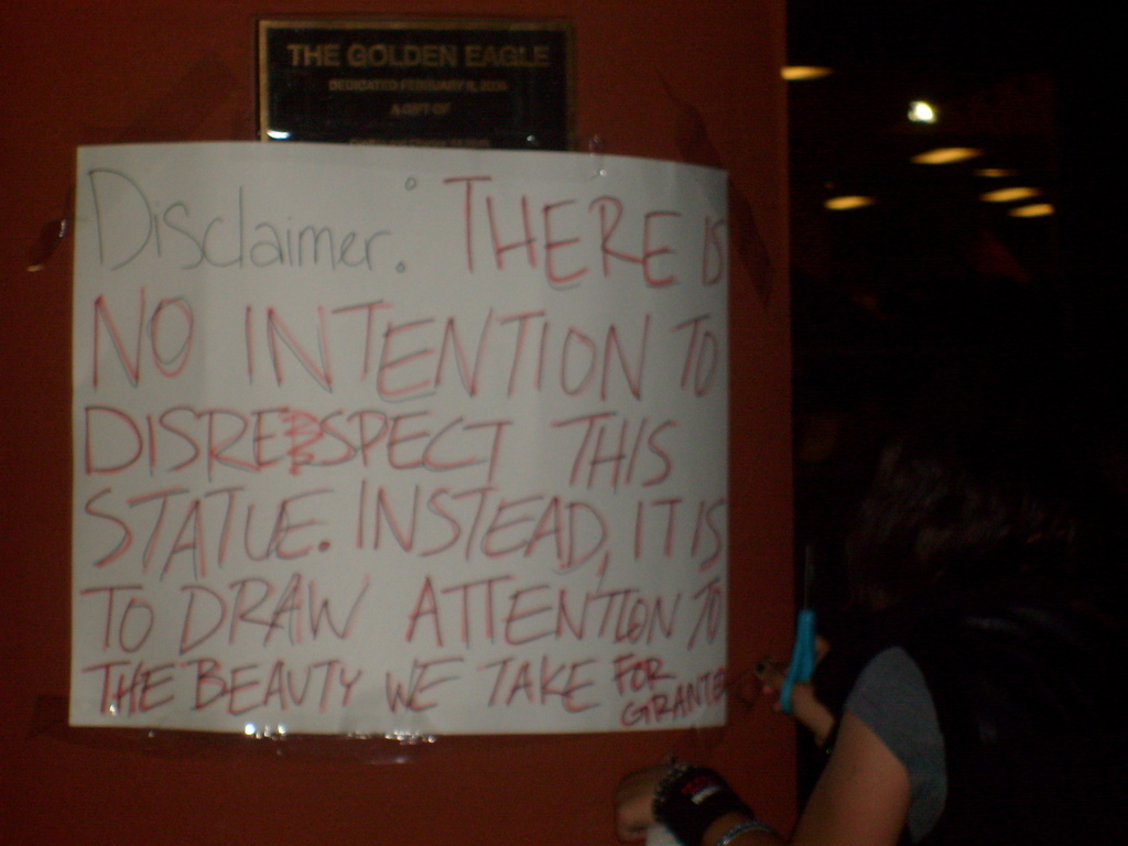 So the target of this task was our campus mascot, The Golden Eagle statue. Ever since this statue was built and set up (in the smack dab middle of the entire campus for everyone to see =)), professors have non-stop complained about how much money was put into this statue, which could've been used to further enhance the education.