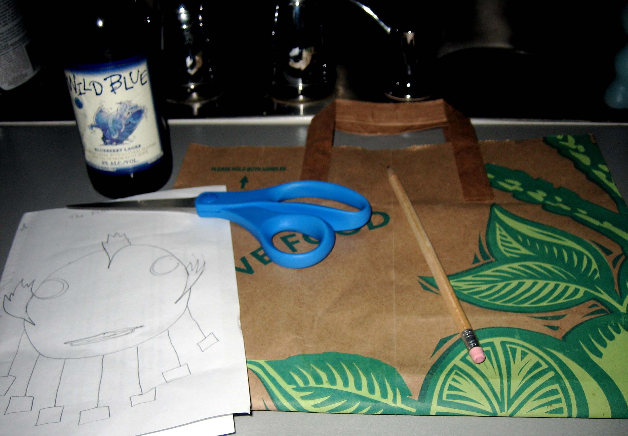I did the sketch at the day job. I did a couple, but I liked this one best. Preparation for transferring the sketch to the paper bag canvas was aided by a bottle of beer, blueberry beer.