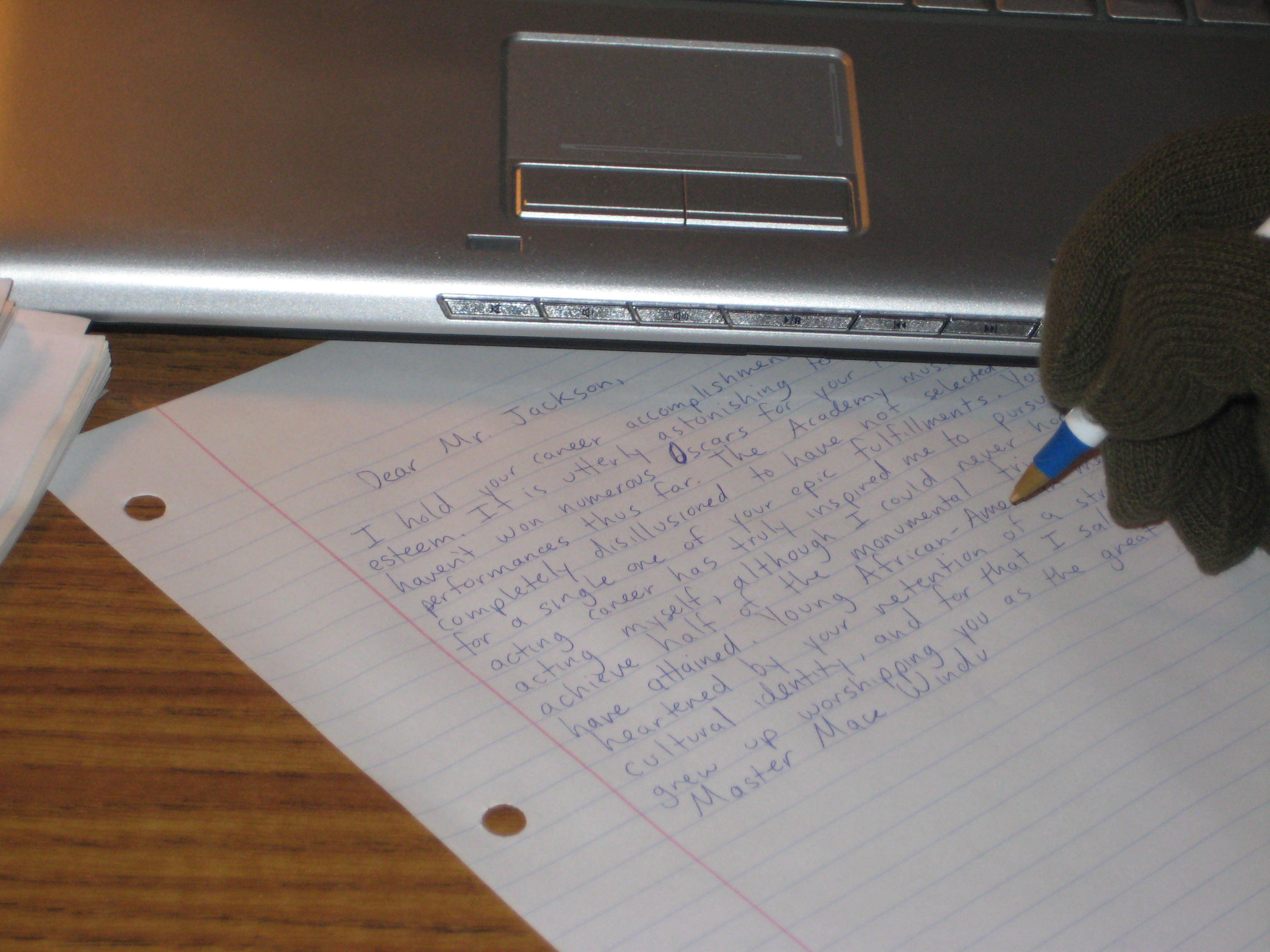 Here's George Jetson's letter in progress. Note the non-dominant left hand and the horrible penmanship.