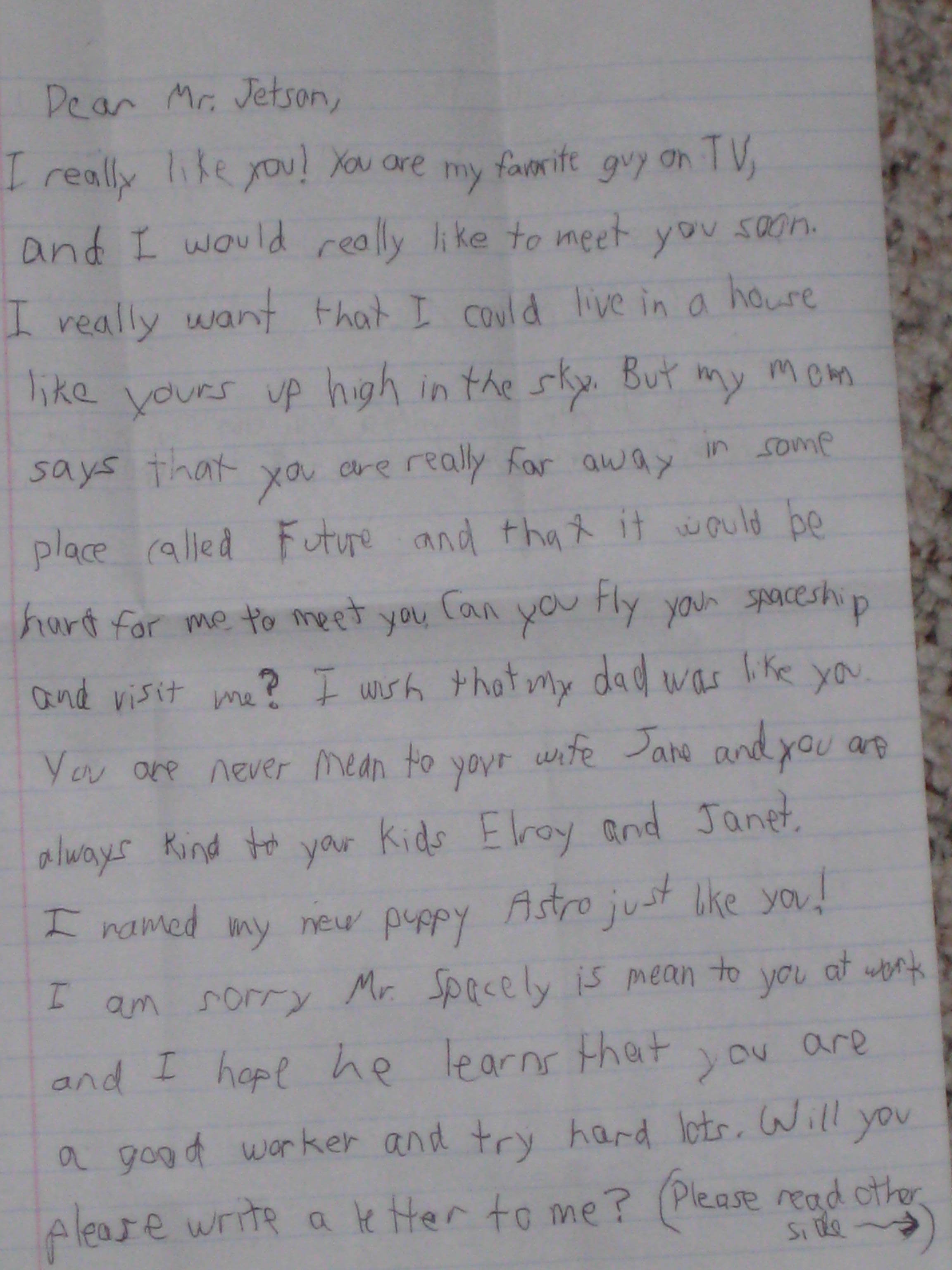 I really like you! You are my favorite guy on TV, and I would really like to meet you soon. I really want that I could live in a house like yours up high in the sky. But my mom says that you are really far away in some place called Future and that it would be hard for me to meet you. Can you fly your spaceship and visit me? I would like you to alot! I wish that my dad would be more like you. You are never mean to your wife Jane and you are always nice to your kids Elroy and Janet. I named my new puppy Astro just like you! I am sorry Mr. Spacely is mean to you at work and I hope he learns that you are a good worker and try hard lots. Will you please write a letter to me? (Please read other side ->) I would like that a lot. Have a good day Mr. Jetson!