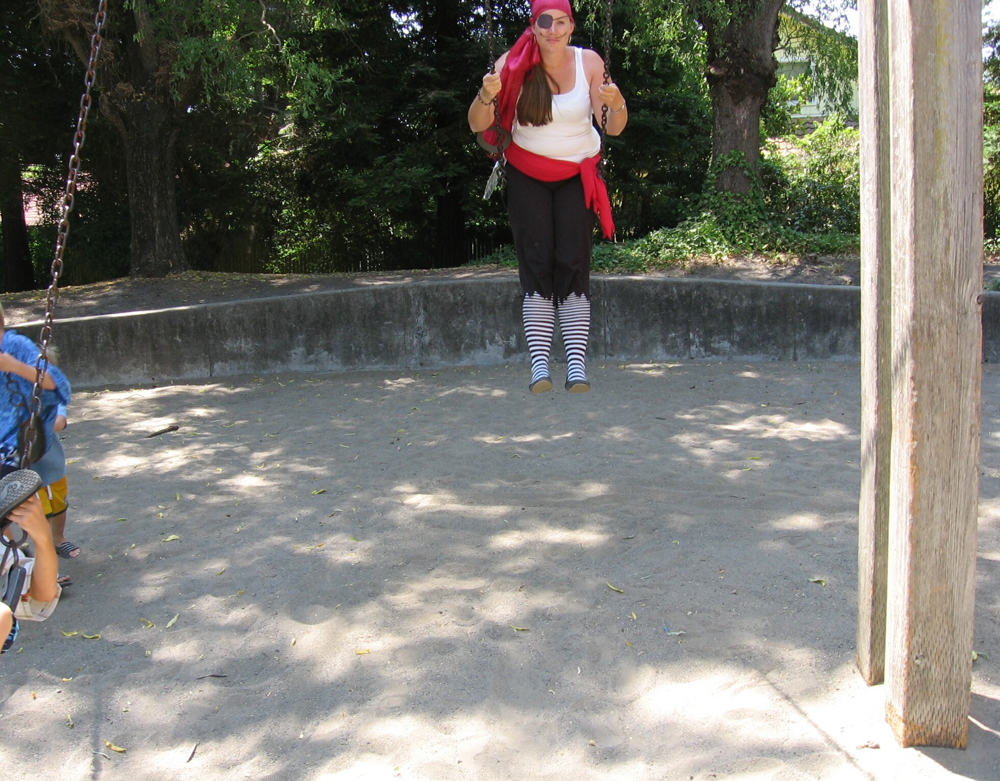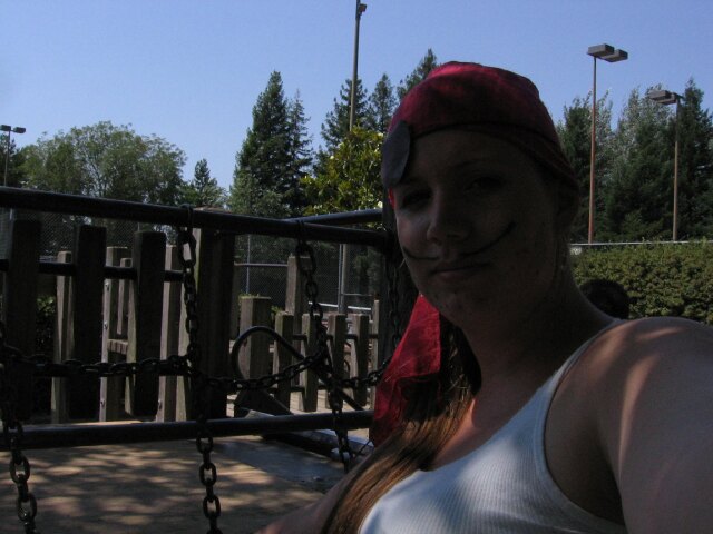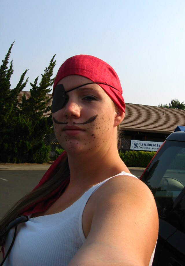 My day as a pirate went swimmingly. I decided to spend the entire day as a pirate which meant going to the store, driving around, going to the park, and going to work in full garb, a mustache, and five o’clock shadow. I work at a day school/summer camp in Sonoma County, so the students were more than shocked to see their female teacher encouraging lying, stealing, and pillaging (I decided to omit the raping part for obvious reasons). Throughout the day I taught the kids the ways of the pirate. We even had a pirate school were they learned to look, think, and act like a pirate. They soon found that pirates don’t whine, they just yell ARRRRRR instead. By the end of the day I taught kids how to swashbuckle, learned that having one eye sucks, and scored some pirate booty that I stole from a kid. Okay I lied. A kid just thought that I should have some treasure and made me earrings and a bracelet (even with my black heart… I can’t steal from a kid). I wish I could have put pictures of my students up sword fighting and yelling ARRRR, but I am not sure of the legal ramifications about putting pictures of children who aren’t my own up on the internet. None the less I have to say spending the day as pirate was very satisfying.