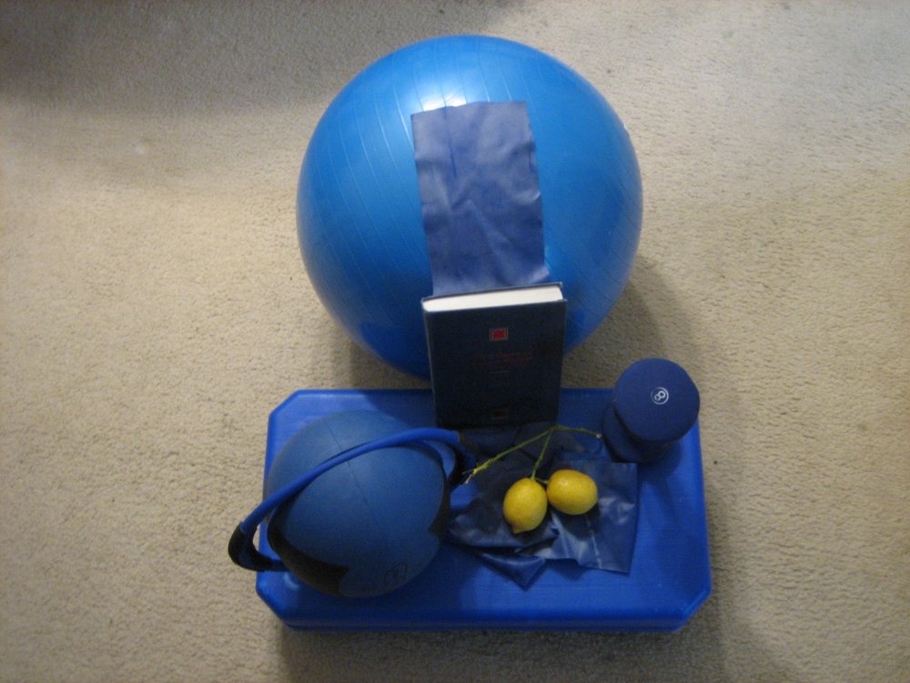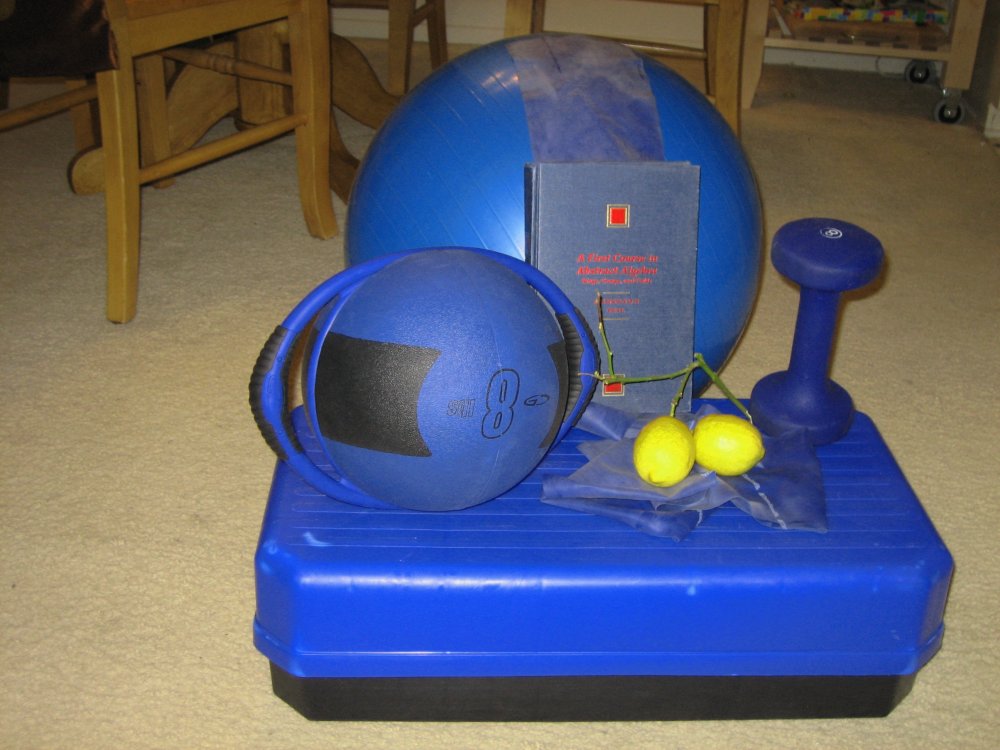 Why is all of this work-out equipment blue, and how often does my girlfriend actually use the medicine ball? Materials: 8 pound medicine ball, 8 pound weight, step, blue ball, rubber strip, "A First Course in Abstract Algebra," lemons fresh from my grandmother's tree.
