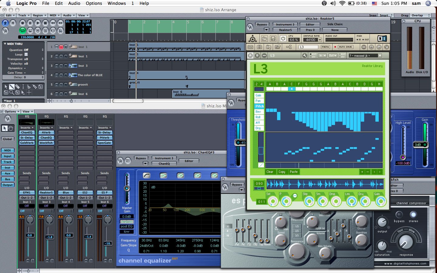 Project, including some open plugins. L3 is the drum machine (an ensemble from Reaktor 5, from which I picked the default Jazz drum loop to modify)