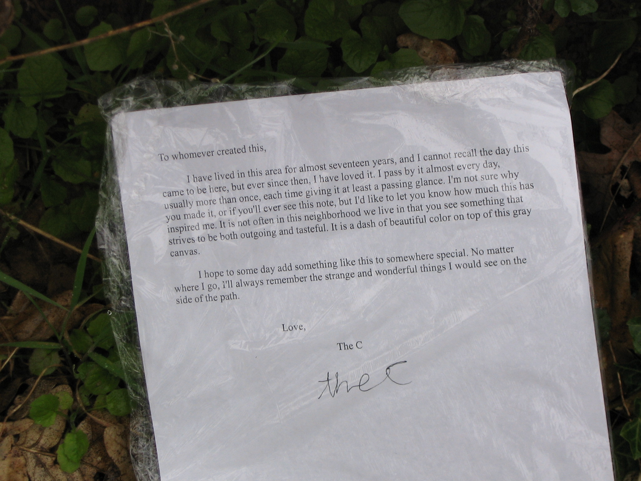 Leaving the letter next to it, but not covering any of it. I had to wrap it in plastic wrap because it was raining. I hope if someone finds it they'll throw it away. The environmentalist in me is screaming.