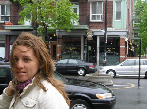 A tired, hair blown me on the corner of Laurier and Jeanne-Mance, Montreal.