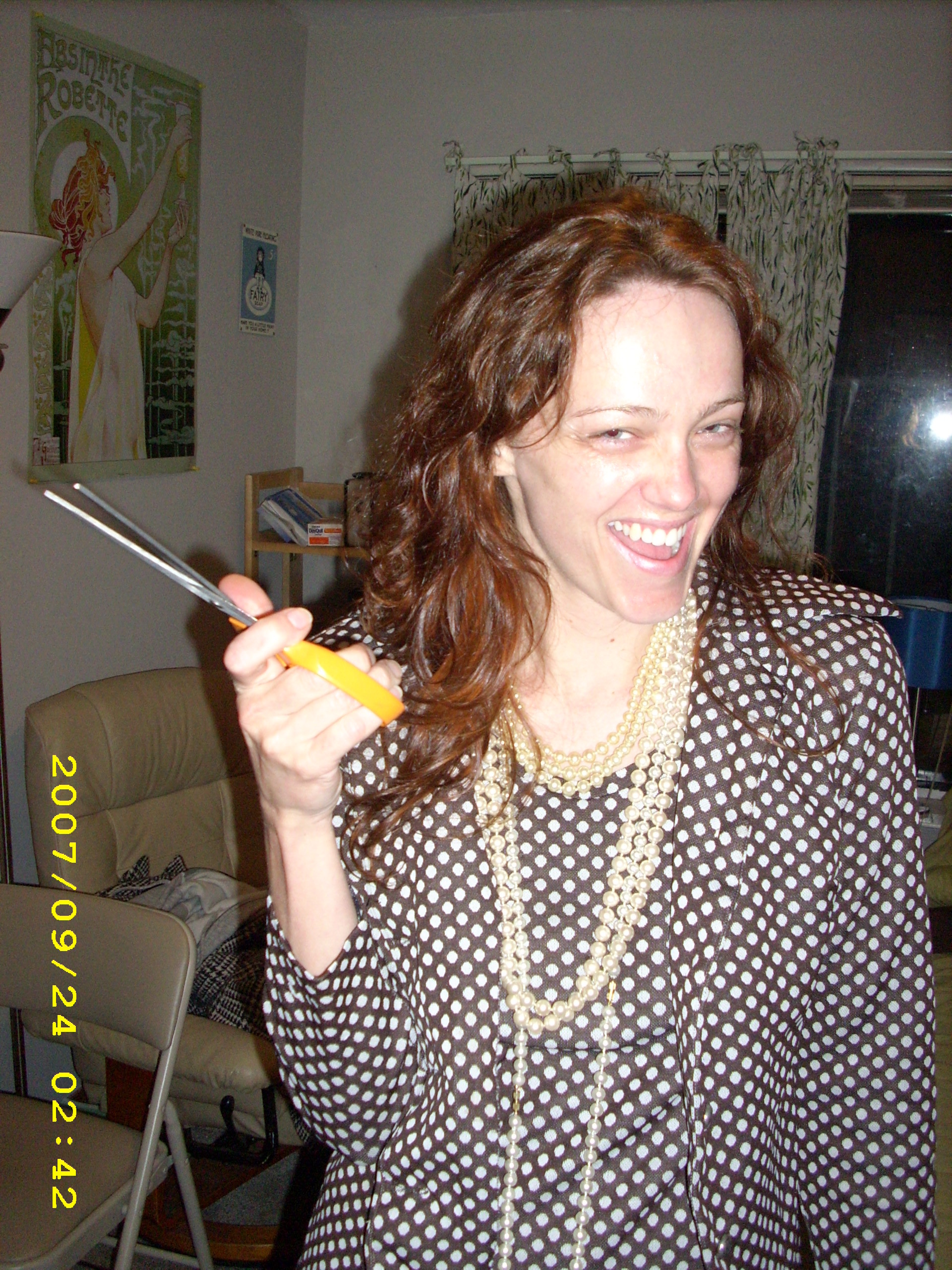 Just as Scarlett succeeded at zipping the snug-fitting garment, she heard a sound distinctly like unzipping and felt her upper back exposed. Alarmed, she moved towards the door calling for the aid of a Hero; this slight movement caused the split zipper to open entirely, while the zipper pull itself dangled from between her shoulder blades. With a truly noble and powerful effort, Bex managed to move the zipper pull slightly, but it became clear to all parties that the dress would have to be removed by Other Means. This evening tragically marked the end of Scarlett's ownership of a shiny, shiny tube dress. And yet, being cut out of a tight garment by a sexy lady was a lot of fun!
